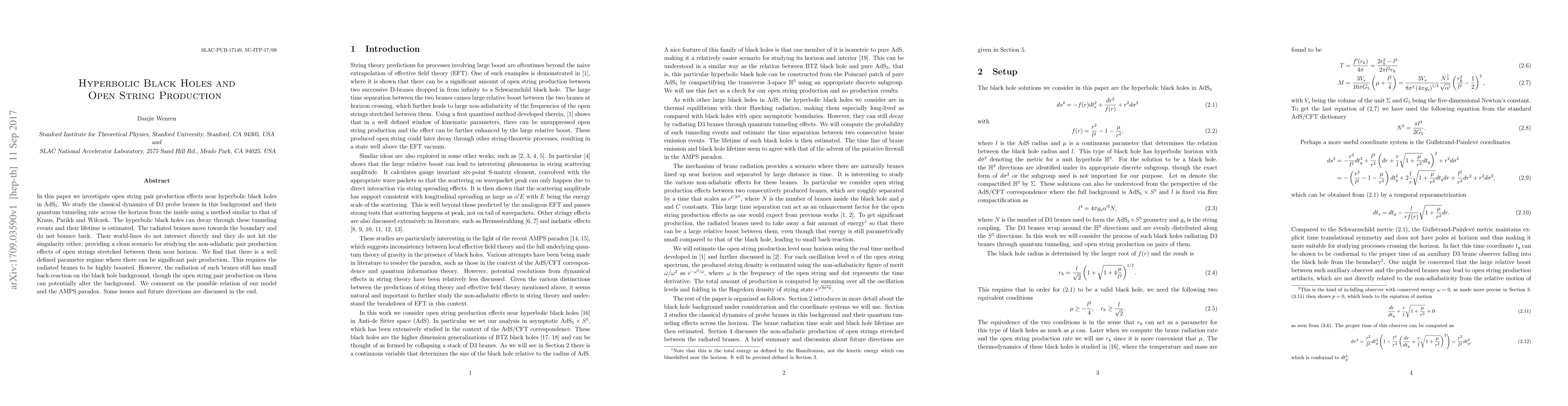 In this paper we investigate open string pair production effects near hyperbolic black holes in AdS$_5$. We study the classical dynamics of D3 probe branes in this background and their quantum tunneling rate across the horizon from the inside using a method similar to that of Kraus, Parikh and Wilczek. The hyperbolic black holes can decay through these tunneling events and their lifetime is estimated. The radiated branes move towards the boundary and do not bounce back. Their world-lines do not intersect directly and they do not hit the singularity either, providing a clean scenario for studying the non-adiabatic pair production effects of open strings stretched between them near horizon. We find that there is a well defined parameter regime where there can be significant pair production. This requires the radiated branes to be highly boosted. However, the radiation of such branes still has small back-reaction on the black hole background, though the open string pair production on them can potentially alter the background. We comment on the possible relation of our model and the AMPS paradox. Some issues and future directions are discussed in the end.