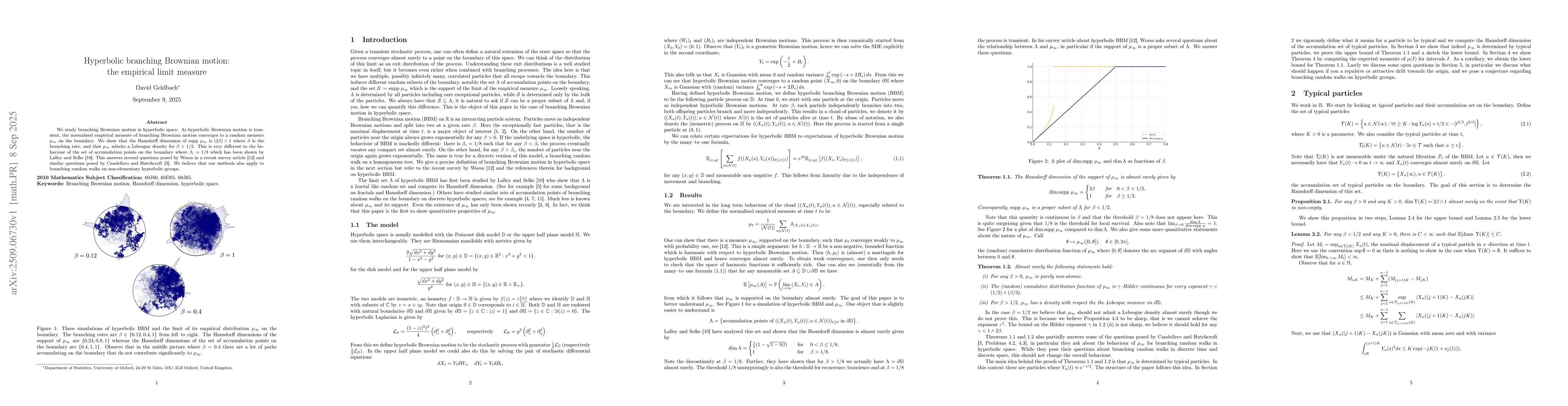 We study branching Brownian motion in hyperbolic space. As hyperbolic Brownian motion is transient, the normalised empirical measure of branching Brownian motion converges to a random measure $\mu_\infty$ on the boundary. We show that the Hausdorff dimension of $\mathrm{supp}\ \mu_\infty$ is $(2\beta)\wedge 1$ where $\beta$ is the branching rate, and that $\mu_\infty$ admits a Lebesgue density for $\beta>1/2$. This is very different to the behaviour of the set of accumulation points on the boundary where $\beta_c=1/8$ which has been shown by Lalley and Selke. This answers several questions posed by Woess in a recent survey article and similar questions posed by Candellero and Hutchcroft. We believe that our methods also apply to branching random walks on non-elementary hyperbolic groups.