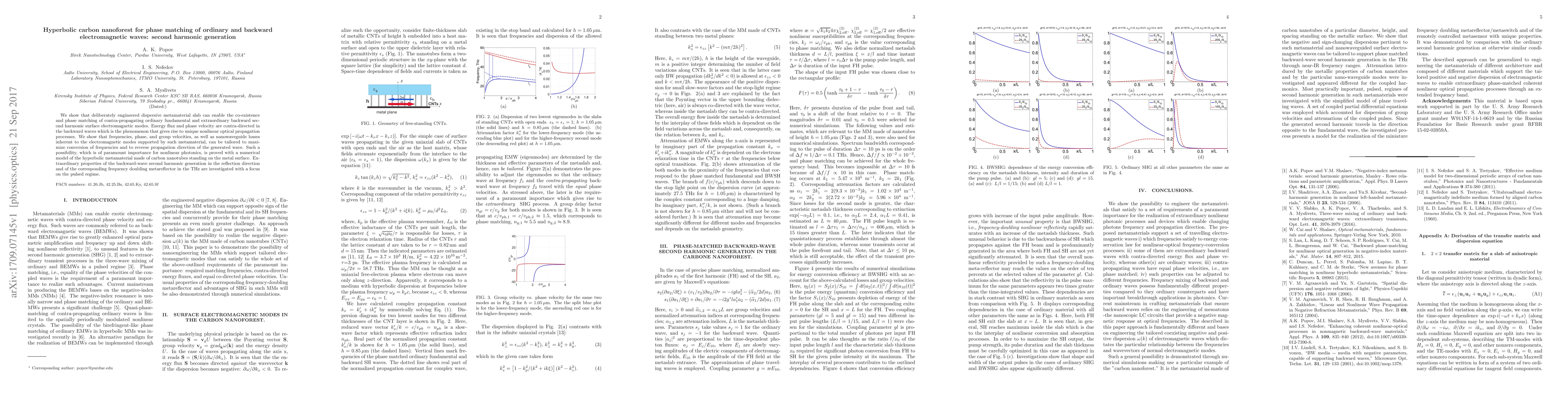 This paper demonstrates how a hyperbolic carbon nanoforest metamaterial can enable phase matching for both ordinary and backward electromagnetic waves, facilitating second harmonic generation. The engineered metamaterial allows for unique nonlinear optical processes by tailoring frequencies, phase, and group velocities to maximize frequency conversion and reverse wave propagation direction.