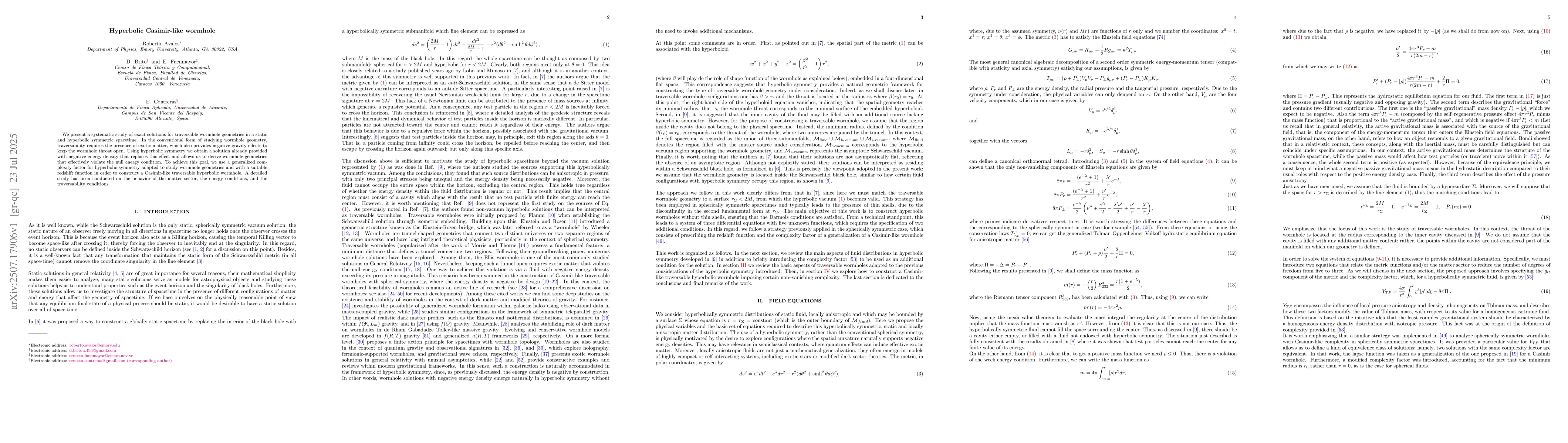 We present a systematic study of exact solutions for traversable wormhole geometries in a static and hyperbolic symmetric spacetime. In the conventional form of studying wormhole geometry, traversability requires the presence of exotic matter, which also provides negative gravity effects to keep the wormhole throat open. Using hyperbolic symmetry we obtain a solution already provided with negative energy density that replaces this effect and allows us to derive wormhole geometries that effectively violate the null energy condition. To achieve this goal, we use a generalized complexity factor for hyperbolic symmetry adapted to study wormhole geometries and with a suitable redshift function in order to construct a Casimir-like traversable hyperbolic wormhole. A detailed study has been conducted on the behavior of the matter sector, the energy conditions, and the traversability conditions.