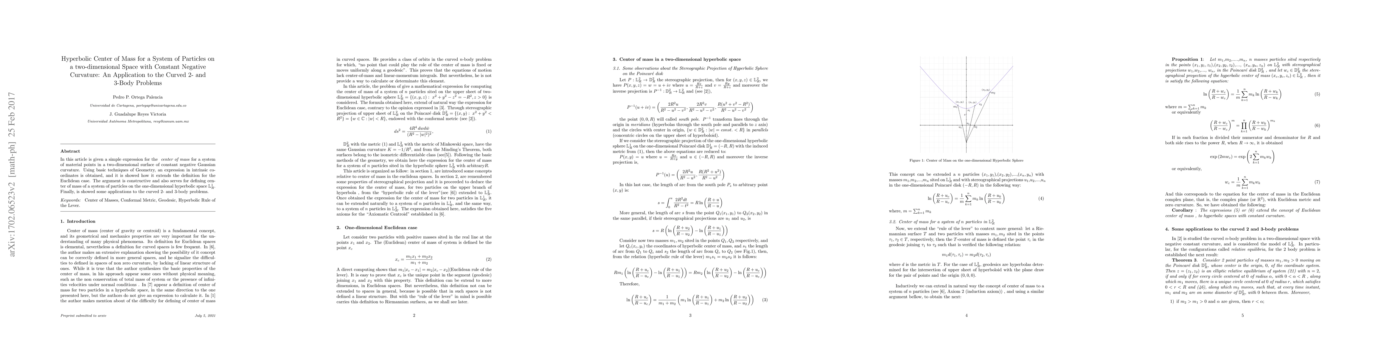 This paper derives a hyperbolic center of mass expression for particles in a two-dimensional space with constant negative curvature, extending the Euclidean definition, and applies it to solve curved $2$- and $3$-body problems. The method is also extended to one-dimensional hyperbolic space.
