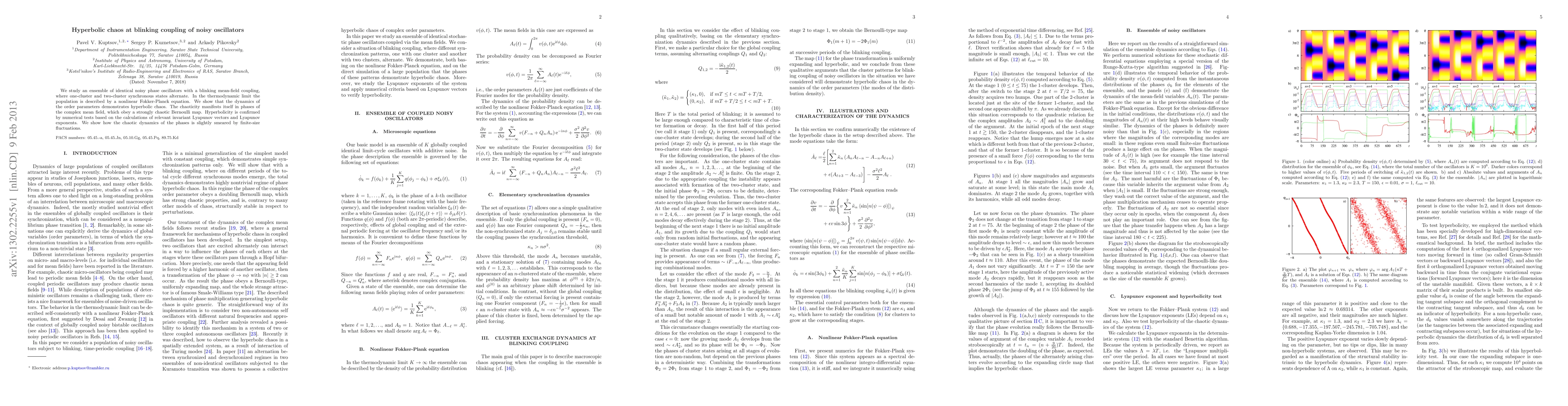 We study an ensemble of identical noisy phase oscillators with a blinking mean-field coupling, where one-cluster and two-cluster synchronous states alternate. In the thermodynamic limit the population is described by a nonlinear Fokker-Planck equation. We show that the dynamics of the order parameters demonstrates hyperbolic chaos. The chaoticity manifests itself in phases of the complex mean field, which obey a strongly chaotic Bernoulli map. Hyperbolicity is confirmed by numerical tests based on the calculations of relevant invariant Lyapunov vectors and Lyapunov exponents. We show how the chaotic dynamics of the phases is slightly smeared by finite-size fluctuations.