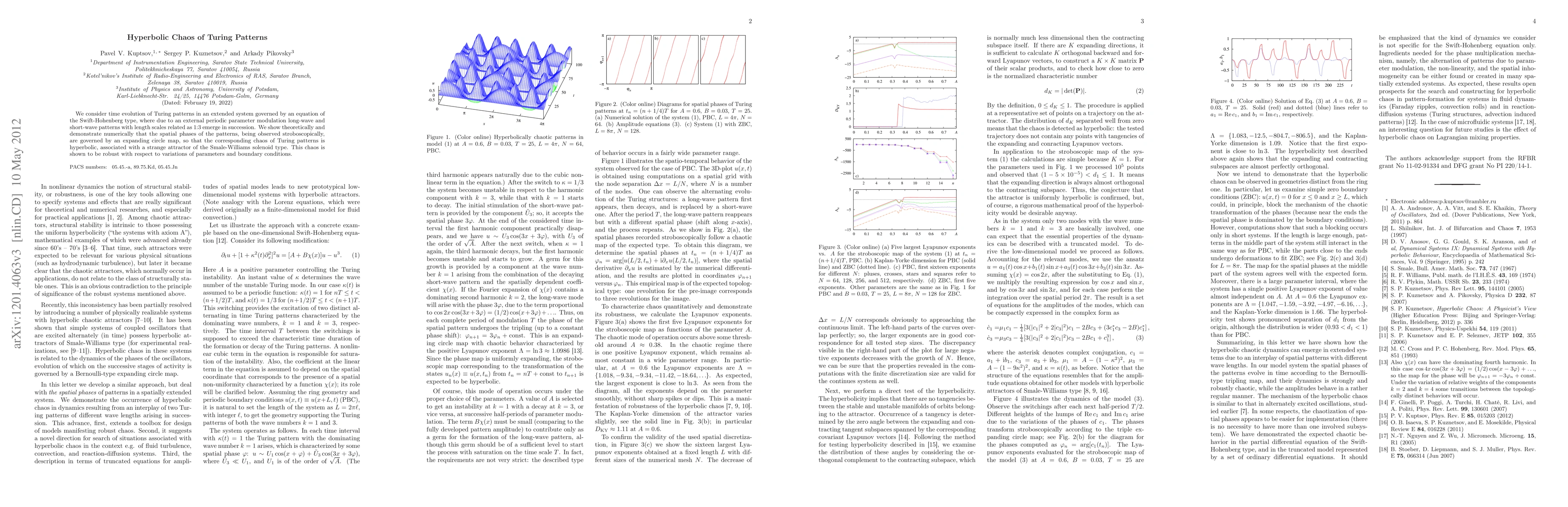 We consider time evolution of Turing patterns in an extended system governed by an equation of the Swift-Hohenberg type, where due to an external periodic parameter modulation long-wave and short-wave patterns with length scales related as 1:3 emerge in succession. We show theoretically and demonstrate numerically that the spatial phases of the patterns, being observed stroboscopically, are governed by an expanding circle map, so that the corresponding chaos of Turing patterns is hyperbolic, associated with a strange attractor of the Smale-Williams solenoid type. This chaos is shown to be robust with respect to variations of parameters and boundary conditions.