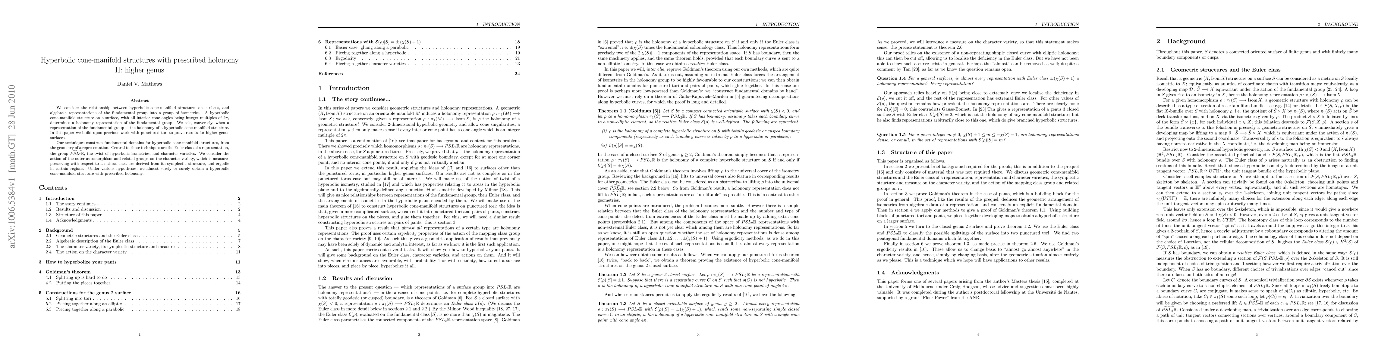 This paper investigates hyperbolic cone-manifold structures on higher genus surfaces and their relationship with algebraic representations of the fundamental group. It builds on previous work to construct fundamental domains for these structures using techniques involving the Euler class, $\widetilde{PSL_2\R}$, and character varieties, proving the existence of such structures under certain conditions.