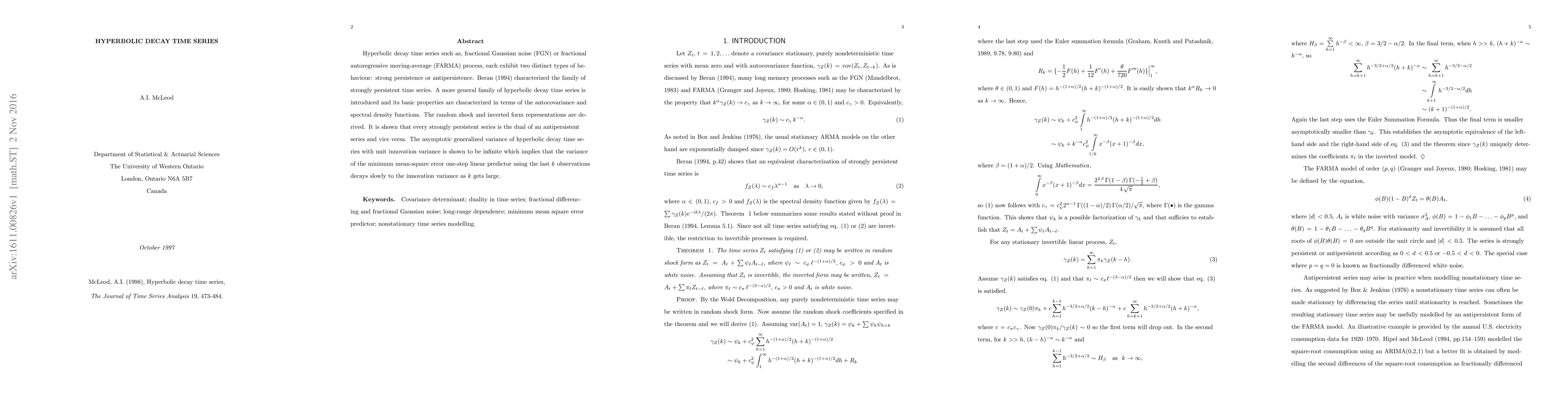 Hyperbolic decay time series such as, fractional Gaussian noise (FGN) or fractional autoregressive moving-average (FARMA) process, each exhibit two distinct types of behaviour: strong persistence or antipersistence. Beran (1994) characterized the family of strongly persistent time series. A more general family of hyperbolic decay time series is introduced and its basic properties are characterized in terms of the autocovariance and spectral density functions. The random shock and inverted form representations are derived. It is shown that every strongly persistent series is the dual of an antipersistent series and vice versa. The asymptotic generalized variance of hyperbolic decay time series with unit innovation variance is shown to be infinite which implies that the variance of the minimum mean-square error one-step linear predictor using the last $k$ observations decays slowly to the innovation variance as $k$ gets large.
