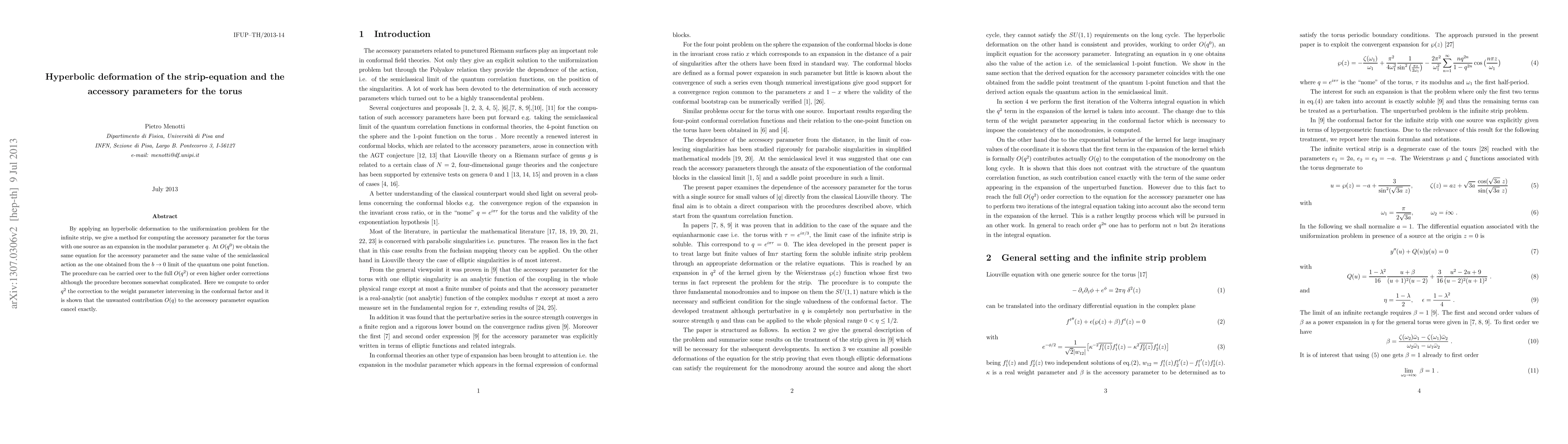By applying an hyperbolic deformation to the uniformization problem for the infinite strip, we give a method for computing the accessory parameter for the torus with one source as an expansion in the modular parameter q. At O(q^0) we obtain the same equation for the accessory parameter and the same value of the semiclassical action as the one obtained from the b -> 0 limit of the quantum one point function. The procedure can be carried over to the full O(q^2) or even higher order corrections although the procedure becomes somewhat complicated. Here we compute to order q^2 the correction to the weight parameter intervening in the conformal factor and it is shown that the unwanted contribution O(q) to the accessory parameter equation cancel exactly.