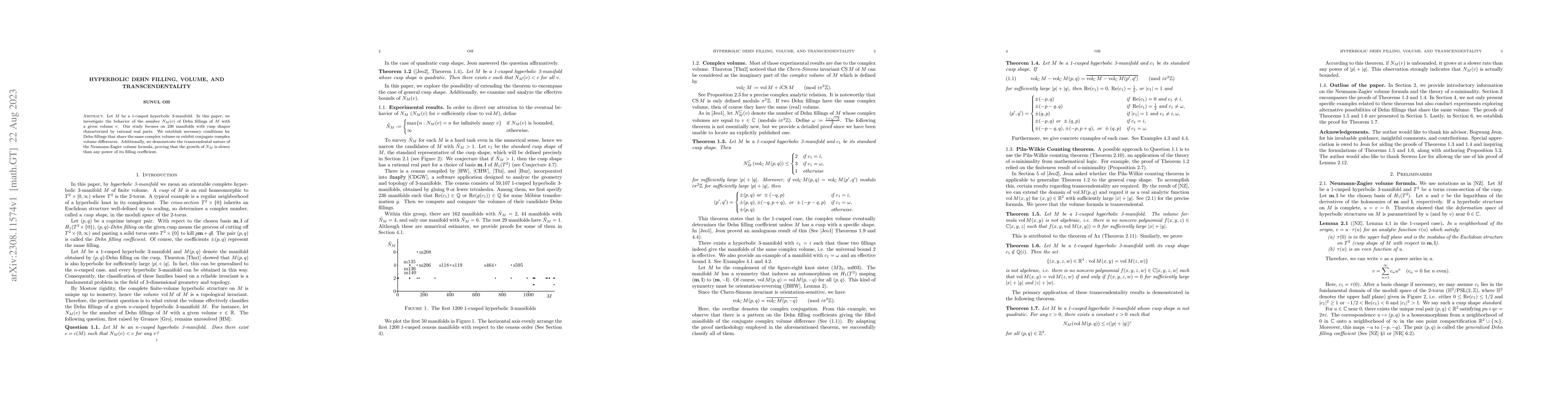 This paper examines the volume behavior of Dehn fillings for 236 specific 1-cusped hyperbolic 3-manifolds, establishing conditions for shared or conjugate complex volumes and proving the transcendental nature of the Neumann-Zagier volume formula, showing slower growth of fillings than any power of the filling coefficient.