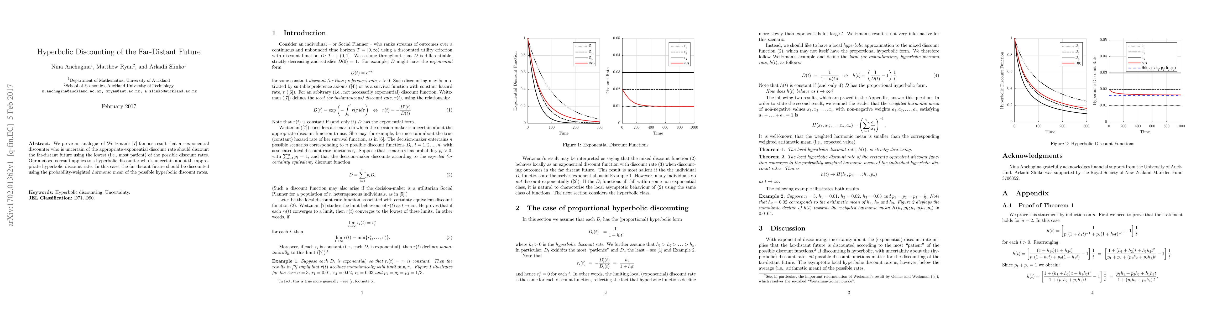 We prove an analogue of Weitzman's (1998) famous result that an exponential discounter who is uncertain of the appropriate exponential discount rate should discount the far-distant future using the lowest (i.e., most patient) of the possible discount rates. Our analogous result applies to a hyperbolic discounter who is uncertain about the appropriate hyperbolic discount rate. In this case, the far-distant future should be discounted using the probability-weighted harmonic mean of the possible hyperbolic discount rates.