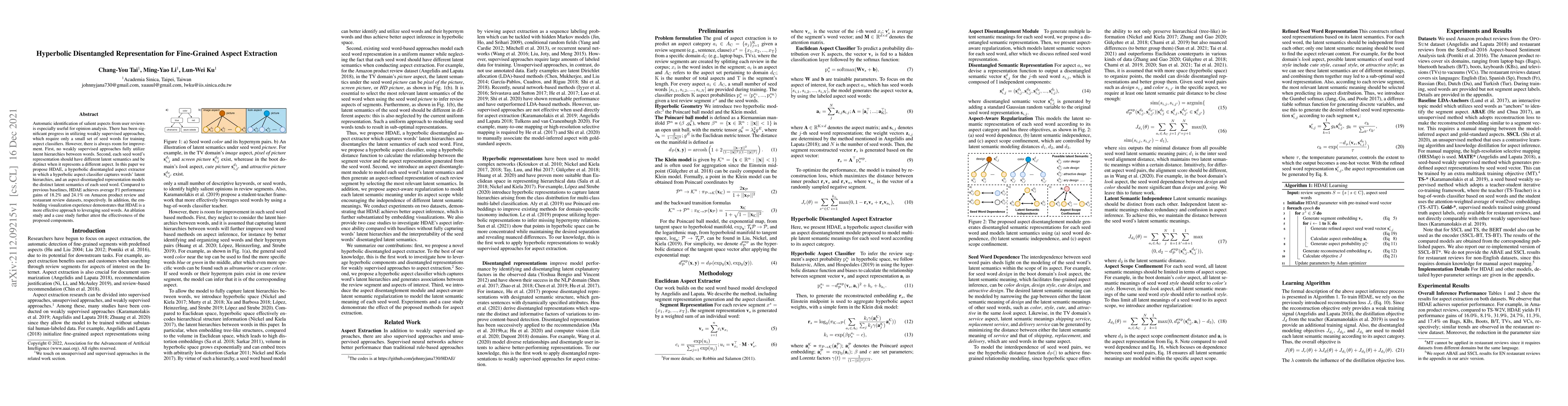 This paper introduces HDAE, a hyperbolic disentangled aspect extractor for fine-grained aspect extraction from user reviews. It leverages hyperbolic geometry to capture word hierarchies and disentangled representations to model distinct semantics of seed words, achieving significant improvements in F1 scores over baselines.