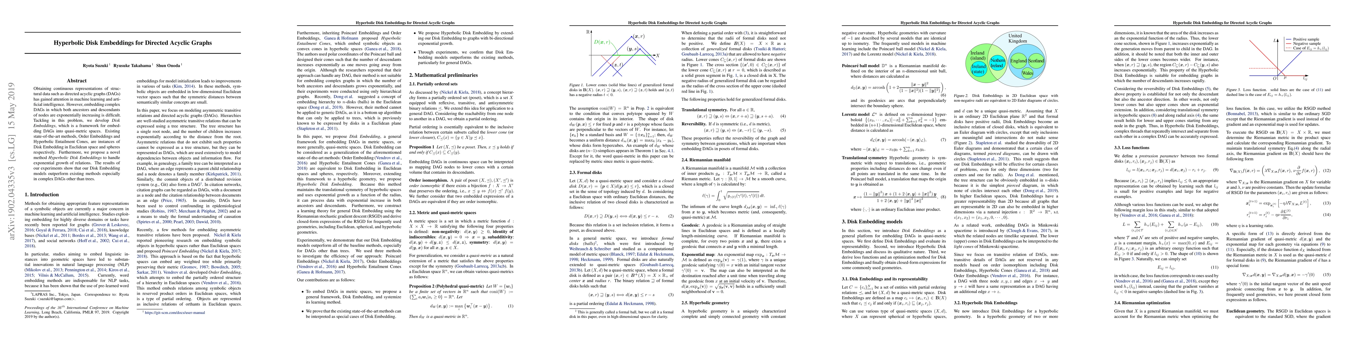 Obtaining continuous representations of structural data such as directed acyclic graphs (DAGs) has gained attention in machine learning and artificial intelligence. However, embedding complex DAGs in which both ancestors and descendants of nodes are exponentially increasing is difficult. Tackling in this problem, we develop Disk Embeddings, which is a framework for embedding DAGs into quasi-metric spaces. Existing state-of-the-art methods, Order Embeddings and Hyperbolic Entailment Cones, are instances of Disk Embedding in Euclidean space and spheres respectively. Furthermore, we propose a novel method Hyperbolic Disk Embeddings to handle exponential growth of relations. The results of our experiments show that our Disk Embedding models outperform existing methods especially in complex DAGs other than trees.