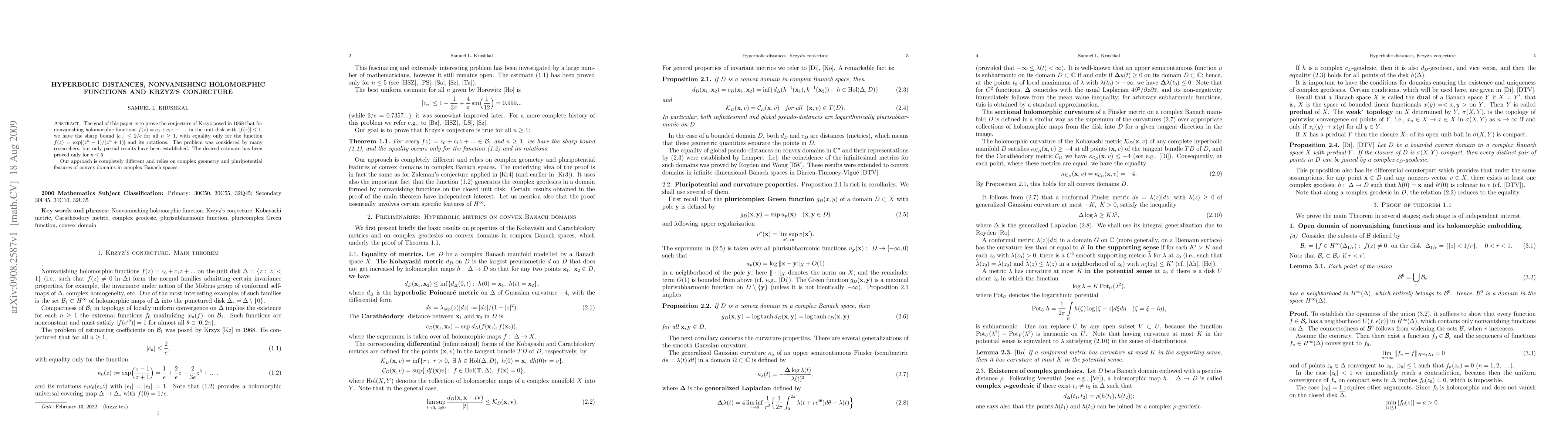 The goal of this paper is to prove the conjecture of Krzyz posed in 1968 that for nonvanishing holomorphic functions $f(z) = c_0 + c_1 z + ...$ in the unit disk with $|f(z)| \le 1$, we have the sharp bound $|c_n| \le 2/e$ for all $n \ge 1$, with equality only for the function $f(z) = \exp [(z^n - 1)/(z^n + 1)]$ and its rotations. The problem was considered by many researchers, but only partial results have been established. The desired estimate has been proved only for $n \le 5$. Our approach is completely different and relies on complex geometry and pluripotential features of convex domains in complex Banach spaces.