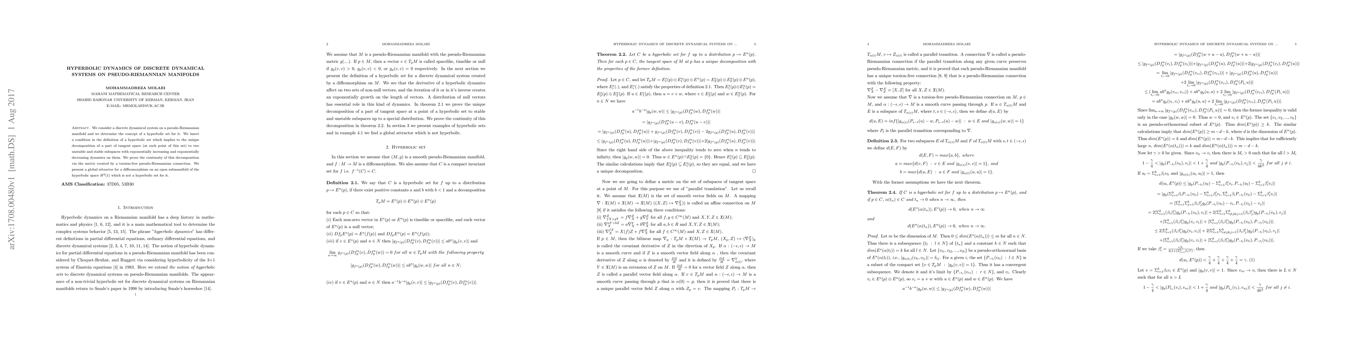 We consider a discrete dynamical system on a pseudo-Riemannian manifold and we determine the concept of a hyperbolic set for it. We insert a condition in the definition of a hyperbolic set which implies to the unique decomposition of a part of tangent space (at each point of this set) to two unstable and stable subspaces with exponentially increasing and exponentially decreasing dynamics on them. We prove the continuity of this decomposition via the metric created by a torsion-free pseudo-Riemannian connection. We present a global attractor for a diffeomorphism on an open submanifold of the hyperbolic space $H^{2}(1)$ which is not a hyperbolic set for it.