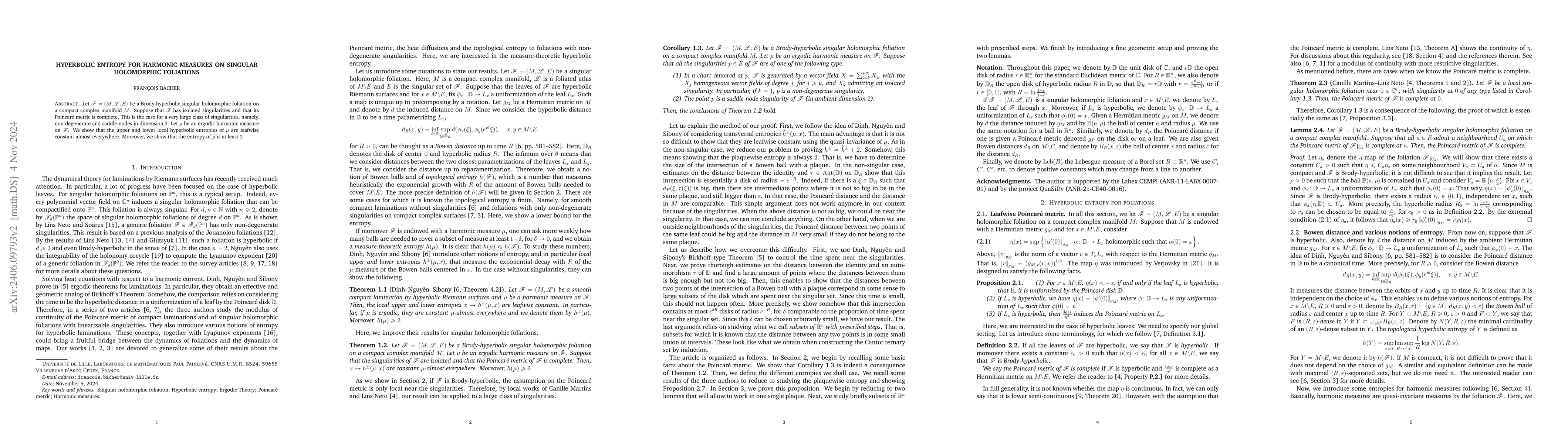 This paper studies hyperbolic entropy for ergodic harmonic measures on singular holomorphic foliations, proving that the upper and lower local hyperbolic entropies are leafwise constant almost everywhere and that the entropy of the measure is at least 2. The foliations considered have isolated singularities and complete Poincaré metrics.