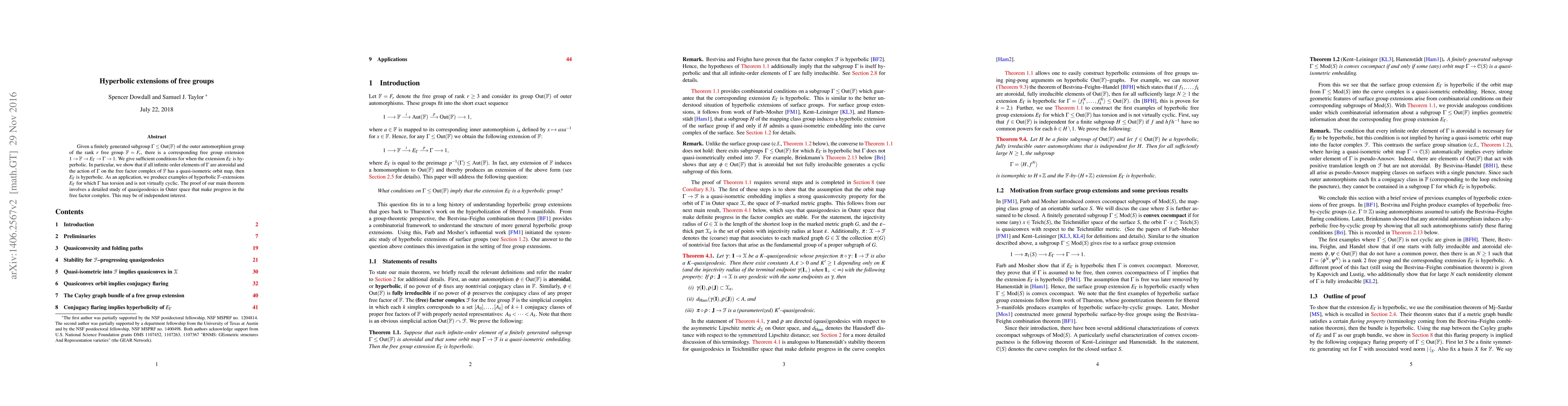 This research paper presents conditions under which extensions of free groups are hyperbolic, focusing on subgroups of the outer automorphism group of free groups. The key findings include demonstrating that if all infinite order elements of the subgroup are atoroidal and the action on the free factor complex has a quasi-isometric orbit map, then the extension is hyperbolic. The methodology involves analyzing quasigeodesics in Outer space and their progression in the free factor complex. The paper provides examples of hyperbolic extensions with torsion and non-virtually cyclic subgroups.