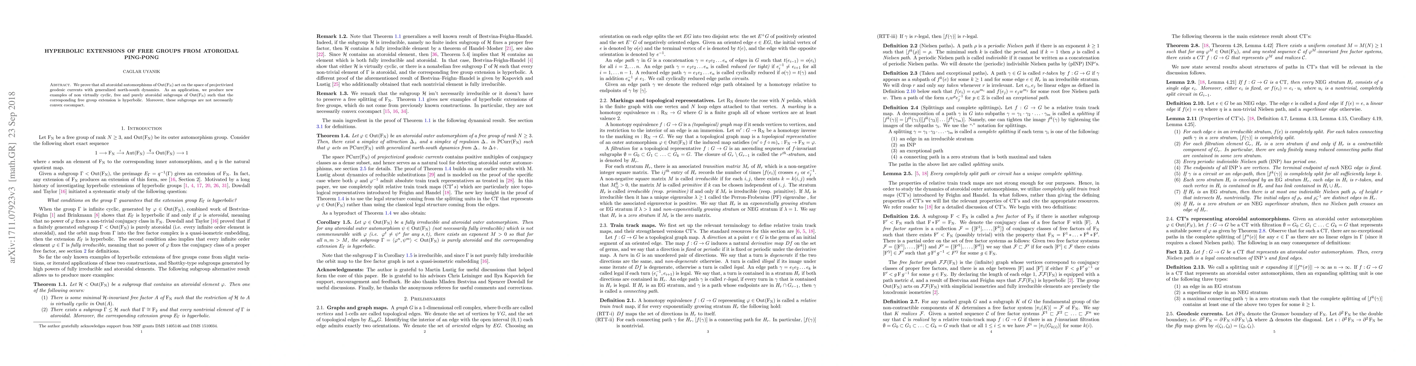 We prove that all atoroidal automorphisms of $Out(F_N)$ act on the space of projectivized geodesic currents with generalized north-south dynamics. As an application, we produce new examples of non virtually cyclic, free and purely atoroidal subgroups of $Out(F_N)$ such that the corresponding free group extension is hyperbolic. Moreover, these subgroups are not necessarily convex cocompact.