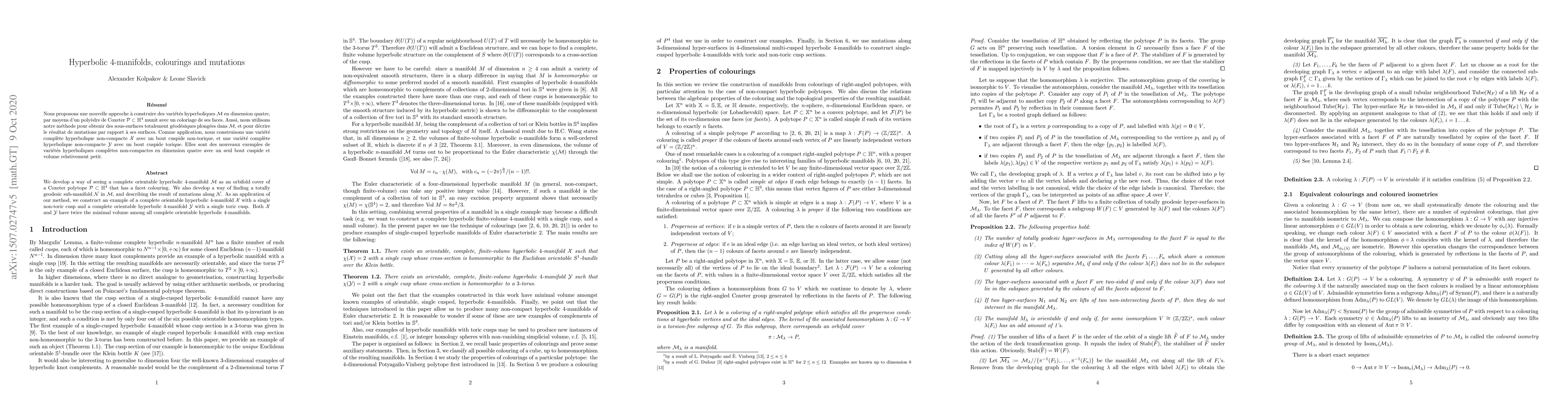 We develop a way of seeing a complete orientable hyperbolic $4$-manifold $\mathcal{M}$ as an orbifold cover of a Coxeter polytope $\mathcal{P} \subset \mathbb{H}^4$ that has a facet colouring. We also develop a way of finding totally geodesic sub-manifolds $\mathcal{N}$ in $\mathcal{M}$, and describing the result of mutations along $\mathcal{N}$. As an application of our method, we construct an example of a complete orientable hyperbolic $4$-manifold $\mathcal{X}$ with a single non-toric cusp and a complete orientable hyperbolic $4$-manifold $\mathcal{Y}$ with a single toric cusp. Both $\mathcal{X}$ and $\mathcal{Y}$ have twice the minimal volume among all complete orientable hyperbolic $4$-manifolds.