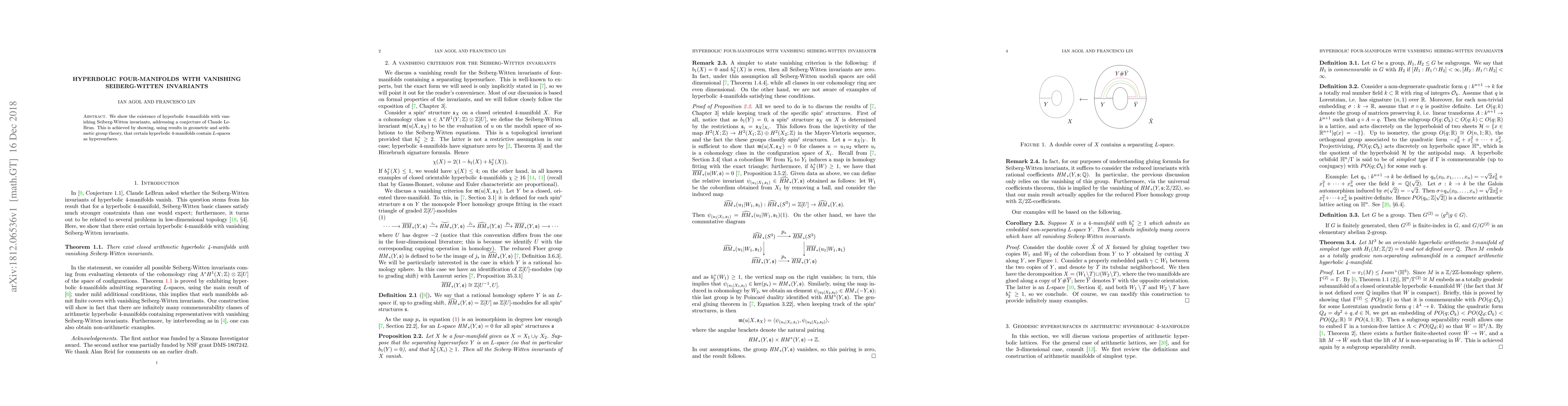 Summary: The research demonstrates the existence of hyperbolic 4-manifolds with zero Seiberg-Witten invariants, supporting a conjecture by Claude LeBrun, through the identification of L-spaces as hypersurfaces within these manifolds using geometric and arithmetic group theory.