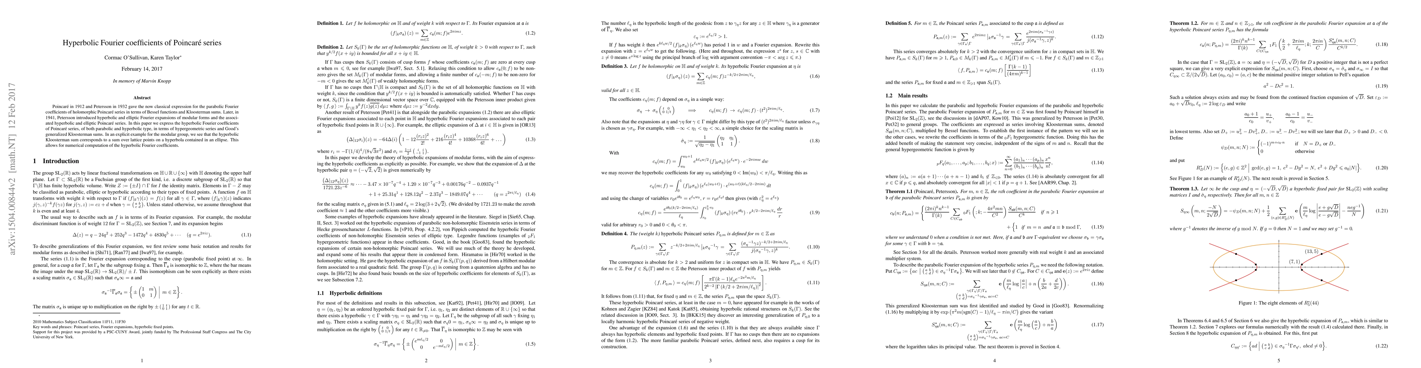 This paper extends classical Fourier expansions to hyperbolic Poincaré series, expressing their hyperbolic Fourier coefficients in terms of hypergeometric series and generalized Kloosterman sums, thus enabling numerical computation for lattice points on hyperbolic structures.
