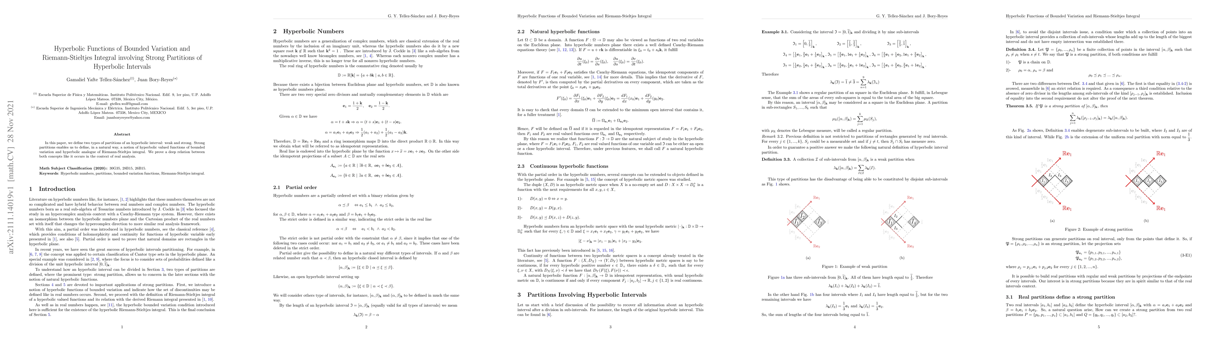 In this paper, we define two types of partitions of an hyperbolic interval: weak and strong. Strong partitions enables us to define, in a natural way, a notion of hyperbolic valued functions of bounded variation and hyperbolic analogue of Riemann-Stieltjes integral. We prove a deep relation between both concepts like it occurs in the context of real analysis.
