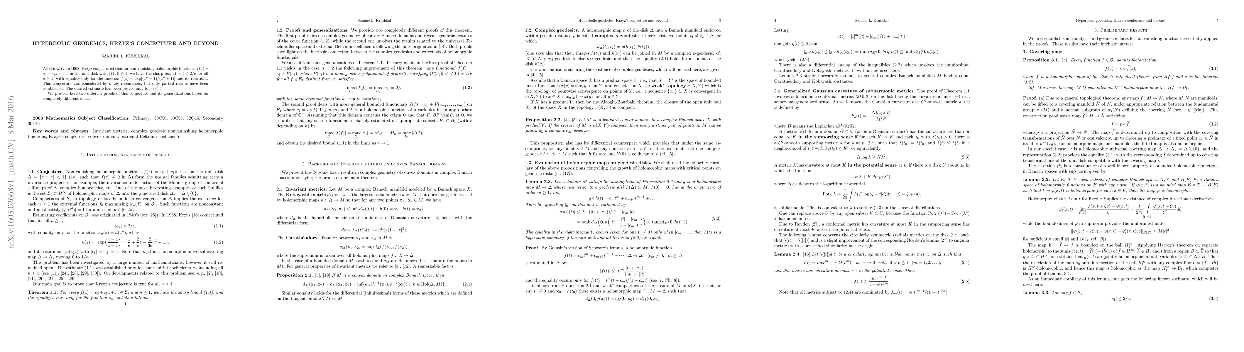 In 1968, Krzyz conjectured that for non-vanishing holomorphic functions $f(z) = c_0 + c_1 z + \dots$ in the unit disk with $|f(z)| \leq 1$, we have the sharp bound $|c_n| \leq 2/e$ for all $n \geq 1$, with equality only for the function $f(z) = exp [(z^n - 1)/(z^n + 1)]$ and its rotations. This conjecture was considered by many researchers, but only partial results have been established. The desired estimate has been proved only for $n \leq 5$. We provide here two different proofs of this conjecture and its generalizations based on completely different ideas.