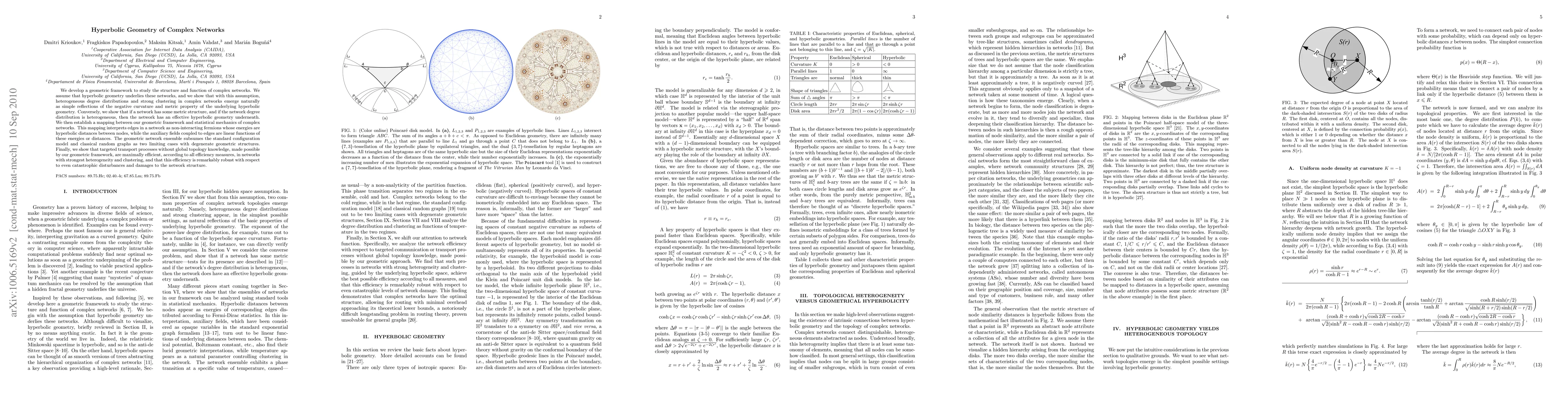 This paper proposes a hyperbolic geometric framework to elucidate the structure and function of complex networks, demonstrating that such geometry naturally explains heterogeneous degree distributions and strong clustering. It also establishes a mapping to statistical mechanics, showing that efficient targeted transport processes can occur in networks with significant heterogeneity and clustering, remaining robust even under network disruptions.