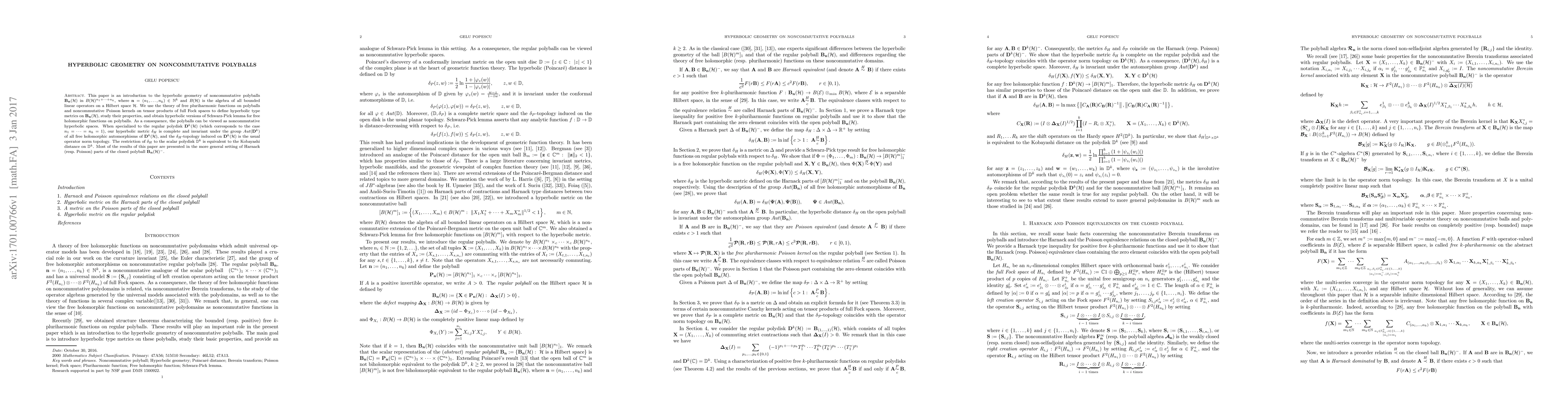 This paper introduces hyperbolic geometry on noncommutative polyballs, defining hyperbolic type metrics using free pluriharmonic functions and noncommutative Poisson kernels. It establishes hyperbolic versions of the Schwarz-Pick lemma for free holomorphic functions and shows that the polyballs can be viewed as noncommutative hyperbolic spaces.
