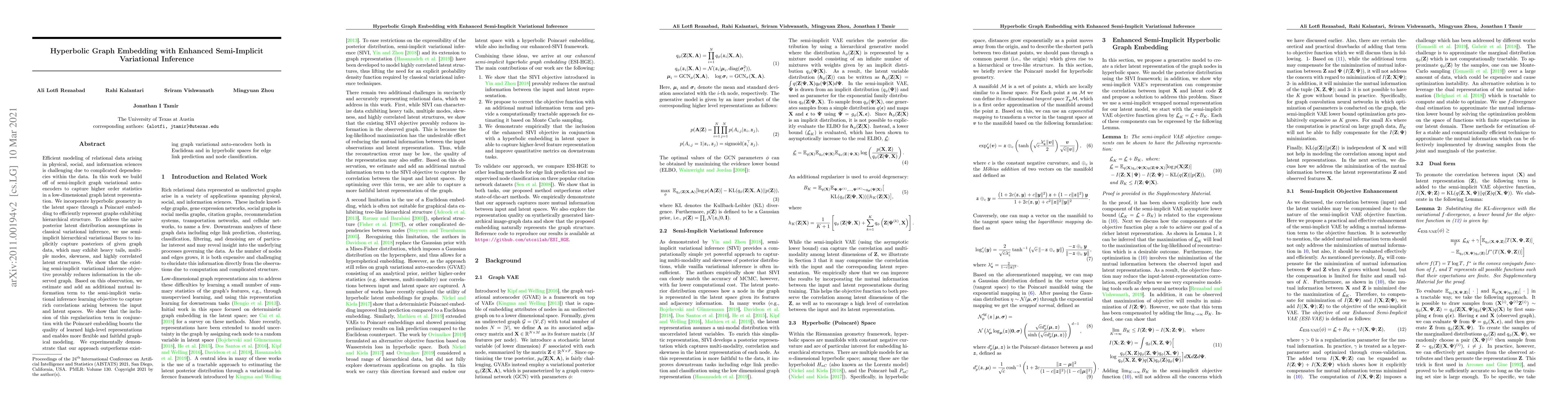 Efficient modeling of relational data arising in physical, social, and information sciences is challenging due to complicated dependencies within the data. In this work, we build off of semi-implicit graph variational auto-encoders to capture higher-order statistics in a low-dimensional graph latent representation. We incorporate hyperbolic geometry in the latent space through a Poincare embedding to efficiently represent graphs exhibiting hierarchical structure. To address the naive posterior latent distribution assumptions in classical variational inference, we use semi-implicit hierarchical variational Bayes to implicitly capture posteriors of given graph data, which may exhibit heavy tails, multiple modes, skewness, and highly correlated latent structures. We show that the existing semi-implicit variational inference objective provably reduces information in the observed graph. Based on this observation, we estimate and add an additional mutual information term to the semi-implicit variational inference learning objective to capture rich correlations arising between the input and latent spaces. We show that the inclusion of this regularization term in conjunction with the Poincare embedding boosts the quality of learned high-level representations and enables more flexible and faithful graphical modeling. We experimentally demonstrate that our approach outperforms existing graph variational auto-encoders both in Euclidean and in hyperbolic spaces for edge link prediction and node classification.