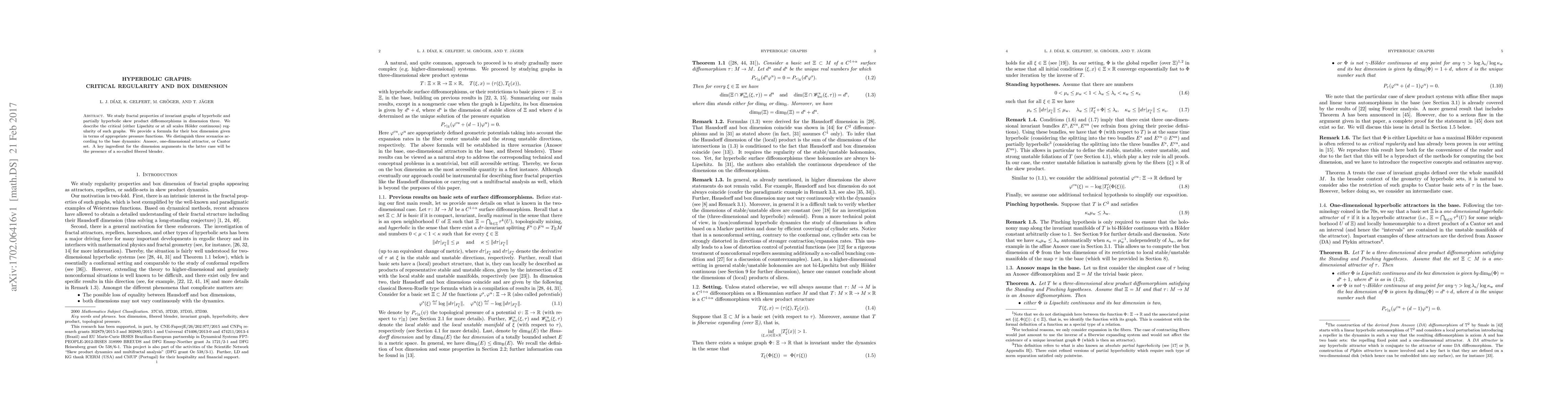 This paper investigates fractal properties of invariant graphs in three-dimensional hyperbolic and partially hyperbolic systems, focusing on their critical regularity and box dimension. It provides a formula linking the box dimension to pressure functions and categorizes scenarios based on the base dynamics, notably highlighting the role of fibered blenders in complex cases.