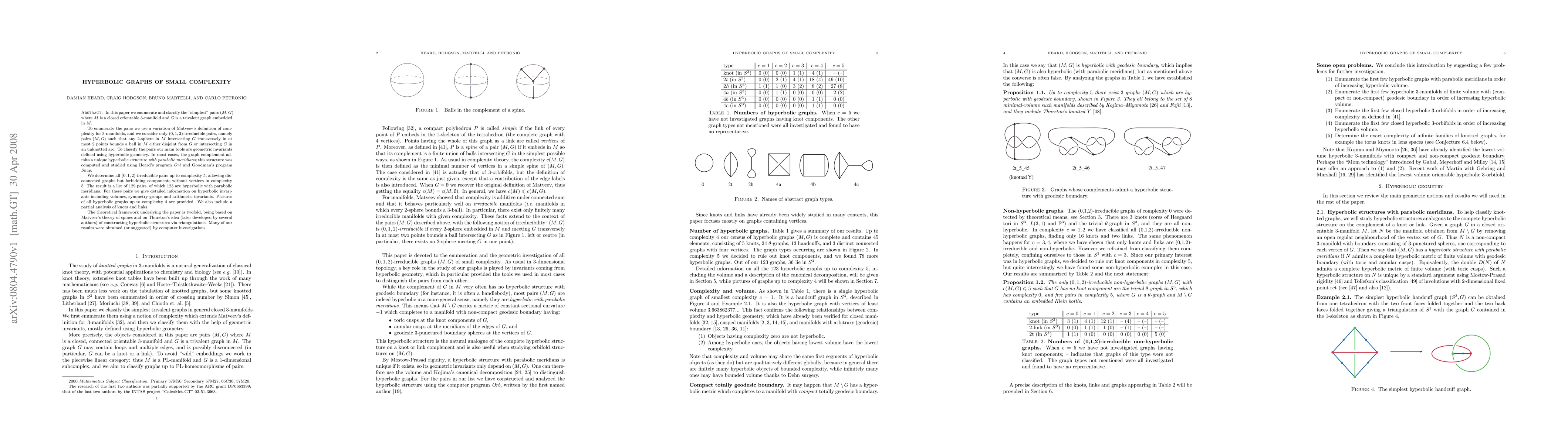 In this paper we enumerate and classify the ``simplest'' pairs (M,G) where M is a closed orientable 3-manifold and G is a trivalent graph embedded in M. To enumerate the pairs we use a variation of Matveev's definition of complexity for 3-manifolds, and we consider only (0,1,2)-irreducible pairs, namely pairs (M,G) such that any 2-sphere in M intersecting G transversely in at most 2 points bounds a ball in M either disjoint from G or intersecting G in an unknotted arc. To classify the pairs our main tools are geometric invariants defined using hyperbolic geometry. In most cases, the graph complement admits a unique hyperbolic structure with parabolic meridians; this structure was computed and studied using Heard's program Orb and Goodman's program Snap. We determine all (0,1,2)-irreducible pairs up to complexity 5, allowing disconnected graphs but forbidding components without vertices in complexity 5. The result is a list of 129 pairs, of which 123 are hyperbolic with parabolic meridians. For these pairs we give detailed information on hyperbolic invariants including volumes, symmetry groups and arithmetic invariants. Pictures of all hyperbolic graphs up to complexity 4 are provided. We also include a partial analysis of knots and links. The theoretical framework underlying the paper is twofold, being based on Matveev's theory of spines and on Thurston's idea (later developed by several authors) of constructing hyperbolic structures via triangulations. Many of our results were obtained (or suggested) by computer investigations.