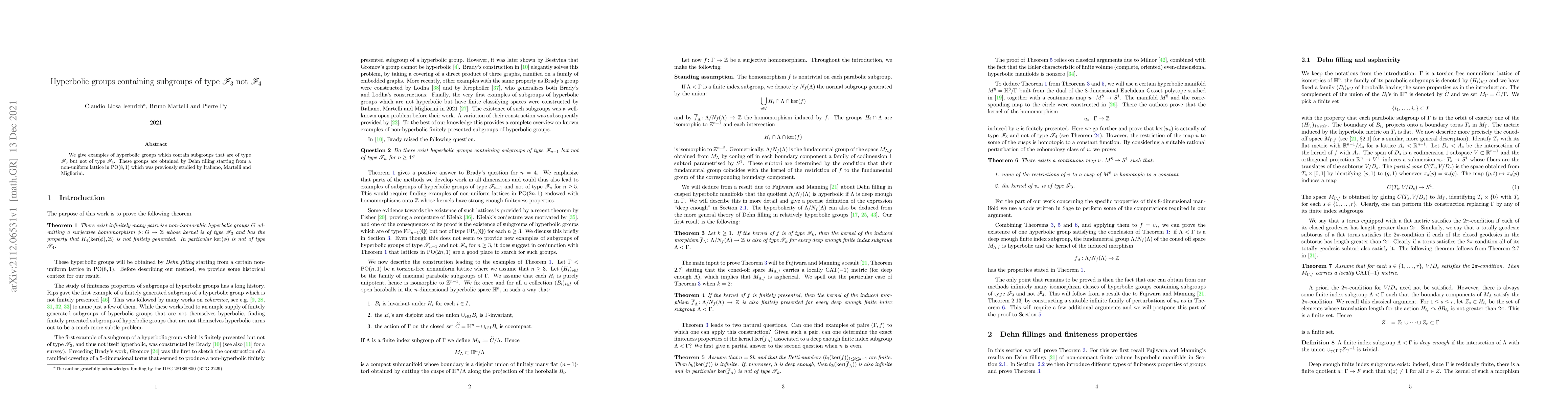 The paper presents hyperbolic groups with subgroups of type F_3 but not F_4, achieved via Dehn filling from a non-uniform lattice in PO(8,1). This work builds on previous research by Italiano, Martelli, and Migliorini.