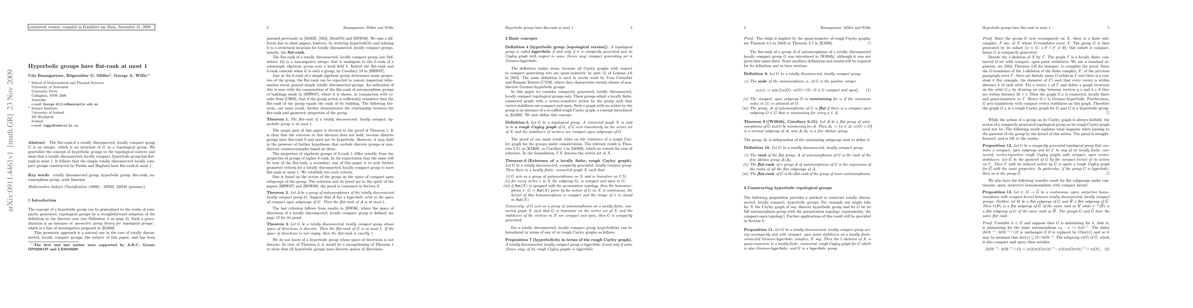 The flat-rank of a totally disconnected, locally compact group G is an integer, which is an invariant of G as a topological group. We generalize the concept of hyperbolic groups to the topological context and show that a totally disconnected, locally compact, hyperbolic group has flat-rank at most 1. It follows that the simple totally disconnected locally compact groups constructed by Paulin and Haglund have flat-rank at most 1.