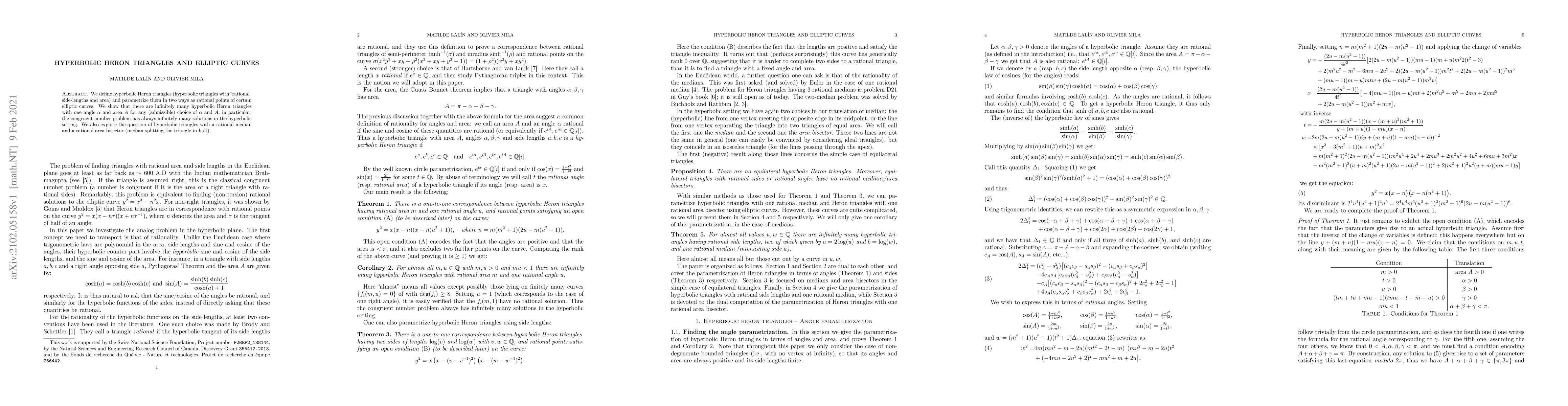 This paper defines hyperbolic Heron triangles and demonstrates their parameterization as rational points on specific elliptic curves. It concludes that for any admissible angle and area, there exist infinitely many such triangles, extending the congruent number problem's solutions to the hyperbolic setting.
