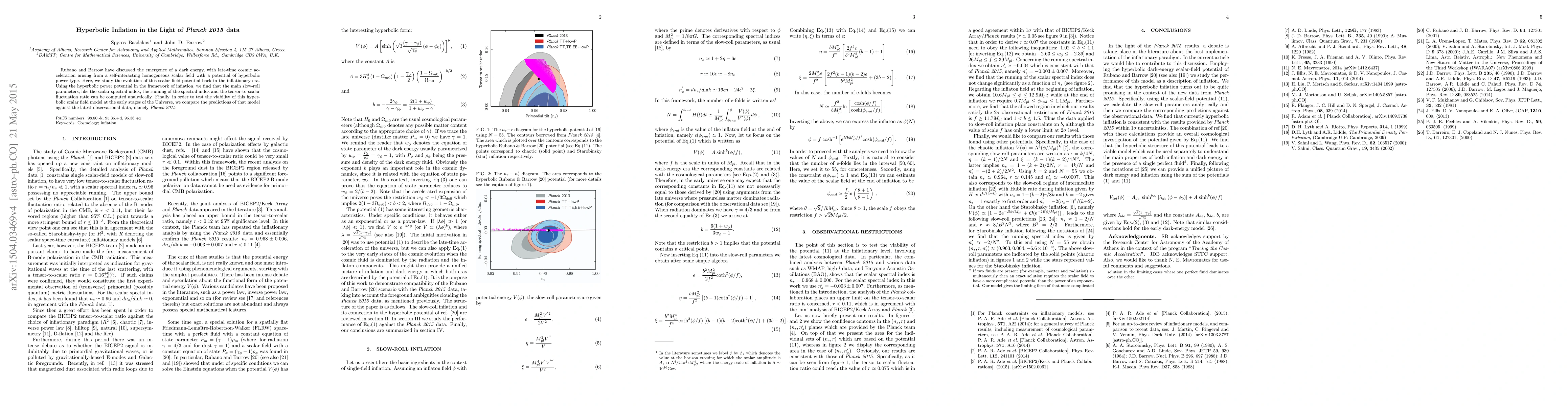 Rubano and Barrow have discussed the emergence of a dark energy, with late-time cosmic acceleration arising from a self-interacting homogeneous scalar field with a potential of hyperbolic power type. Here, we study the evolution of this scalar field potential back in the inflationary era. Using the hyperbolic power potential in the framework of inflation, we find that the main slow-roll parameters, like the scalar spectral index, the running of the spectral index and the tensor-to-scalar fluctuation ratio can be computed analytically. Finally, in order to test the viability of this hyperbolic scalar field model at the early stages of the Universe, we compare the predictions of that model against the latest observational data, namely Planck 2015.