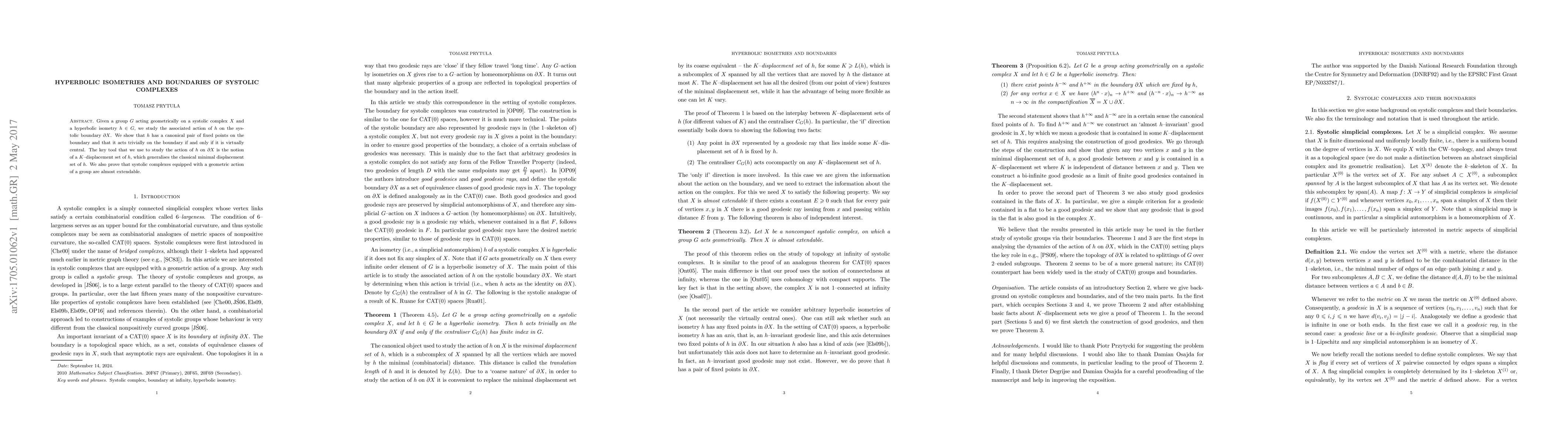 This paper investigates hyperbolic isometries in groups acting geometrically on systolic complexes, demonstrating that such isometries have fixed points on the systolic boundary and are trivially acting if virtually central. The study employs the notion of $K$-displacement sets to analyze these actions and proves the almost extendability of systolic complexes under such group actions.