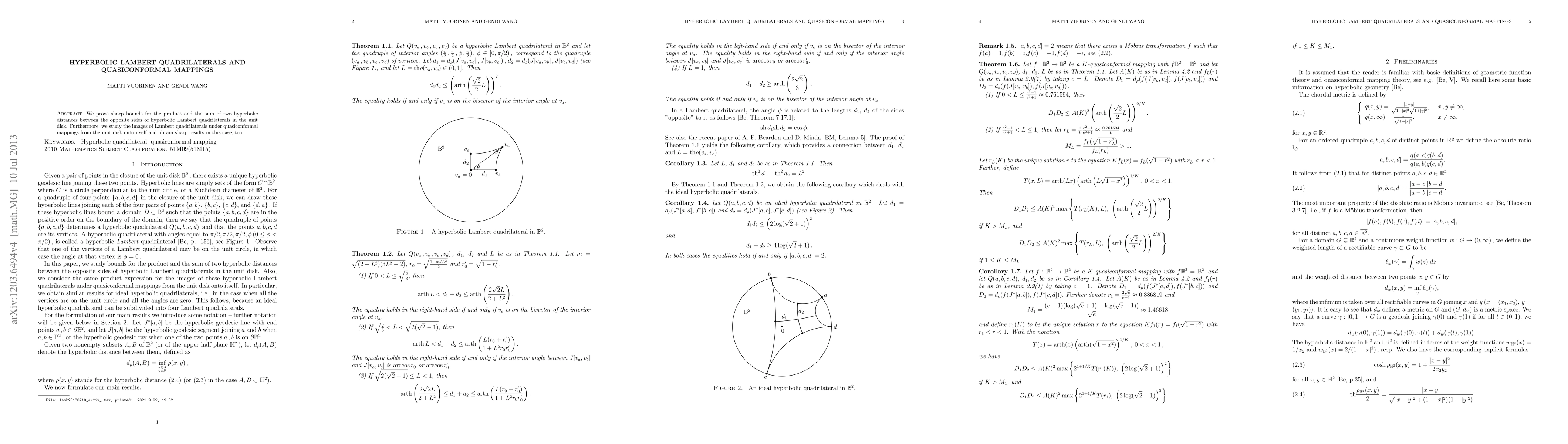 We prove sharp bounds for the product and the sum of two hyperbolic distances between the opposite sides of hyperbolic Lambert quadrilaterals in the unit disk. Furthermore, we study the images of Lambert quadrilaterals under quasiconformal mappings from the unit disk onto itself and obtain sharp results in this case, too.