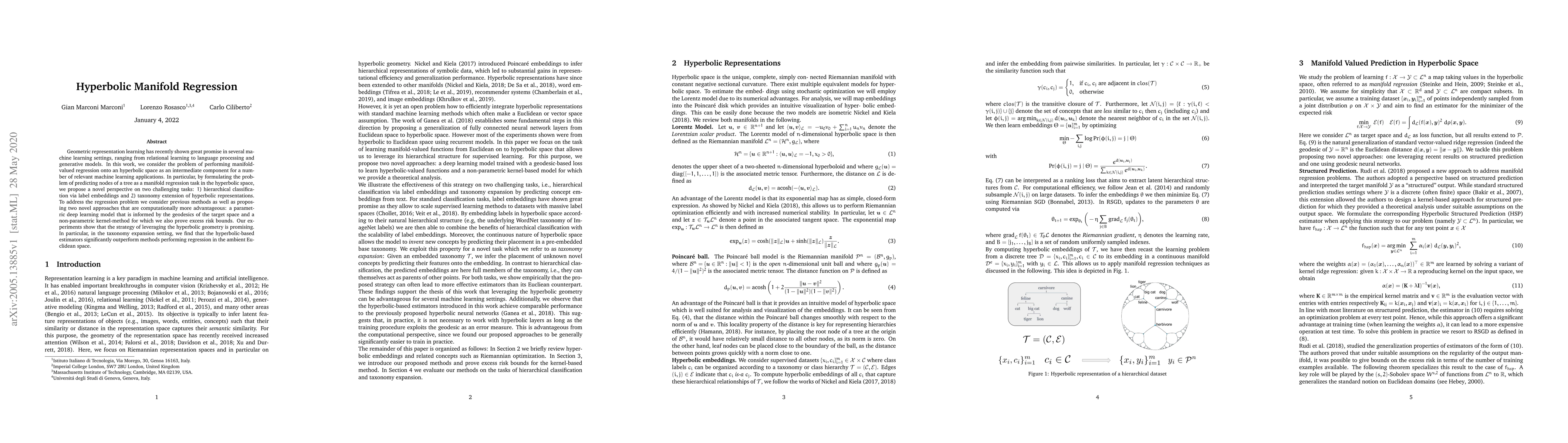 Geometric representation learning has recently shown great promise in several machine learning settings, ranging from relational learning to language processing and generative models. In this work, we consider the problem of performing manifold-valued regression onto an hyperbolic space as an intermediate component for a number of relevant machine learning applications. In particular, by formulating the problem of predicting nodes of a tree as a manifold regression task in the hyperbolic space, we propose a novel perspective on two challenging tasks: 1) hierarchical classification via label embeddings and 2) taxonomy extension of hyperbolic representations. To address the regression problem we consider previous methods as well as proposing two novel approaches that are computationally more advantageous: a parametric deep learning model that is informed by the geodesics of the target space and a non-parametric kernel-method for which we also prove excess risk bounds. Our experiments show that the strategy of leveraging the hyperbolic geometry is promising. In particular, in the taxonomy expansion setting, we find that the hyperbolic-based estimators significantly outperform methods performing regression in the ambient Euclidean space.
