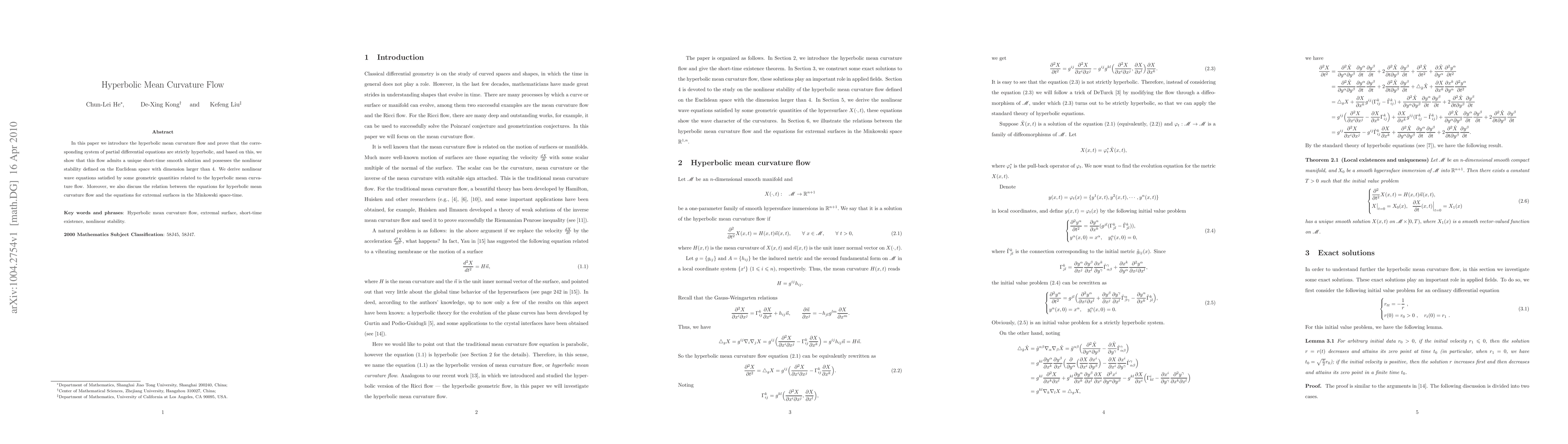 This paper introduces hyperbolic mean curvature flow, proving its system of partial differential equations is strictly hyperbolic, and demonstrates unique short-time smooth solutions with nonlinear stability in dimensions greater than 4. It also explores the connection between hyperbolic mean curvature flow equations and those for extremal surfaces in Minkowski space-time.