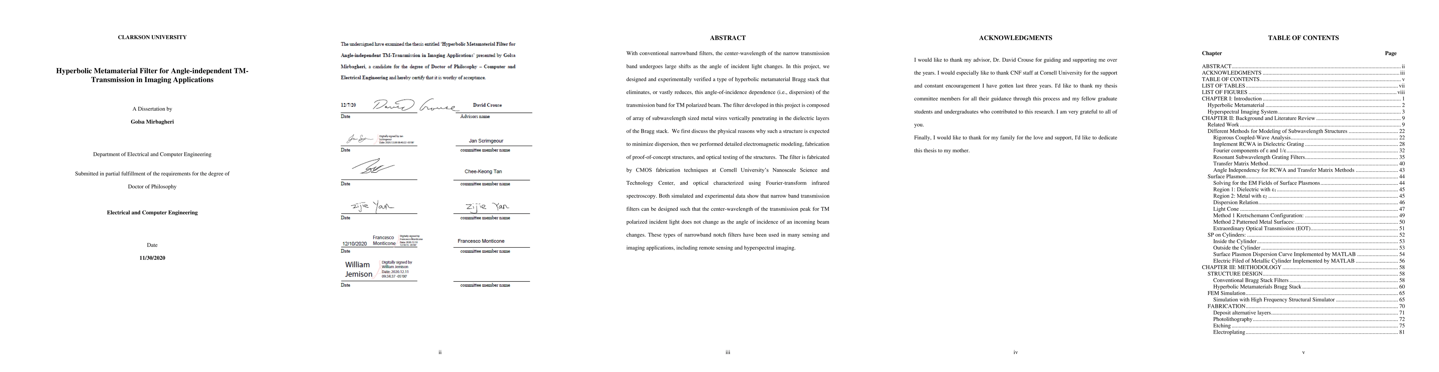 With conventional narrowband filters, the center-wavelength of the narrow transmission band undergoes large shifts as the angle of incident light changes. In this project, we designed and experimentally verified a type of hyperbolic metamaterial Bragg stack that eliminates, or vastly reduces, this angle-of-incidence dependence (i.e., dispersion) of the transmission band for TM polarized beam. The filter developed in this project is composed of array of subwavelength sized metal wires vertically penetrating in the dielectric layers of the Bragg stack. We first discuss the physical reasons why such a structure is expected to minimize dispersion, then we performed detailed electromagnetic modeling, fabrication of proof-of-concept structures, and optical testing of the structures. The filter is fabricated by CMOS fabrication techniques and optical characterized using Fourier-transform infrared spectroscopy. Both simulated and experimental data show that narrow band transmission filters can be designed such that the center-wavelength of the transmission peak for TM polarized incident light does not change as the angle of incidence of an incoming beam changes. These types of narrowband notch filters have been used in many sensing and imaging applications, including remote sensing and hyperspectral imaging.