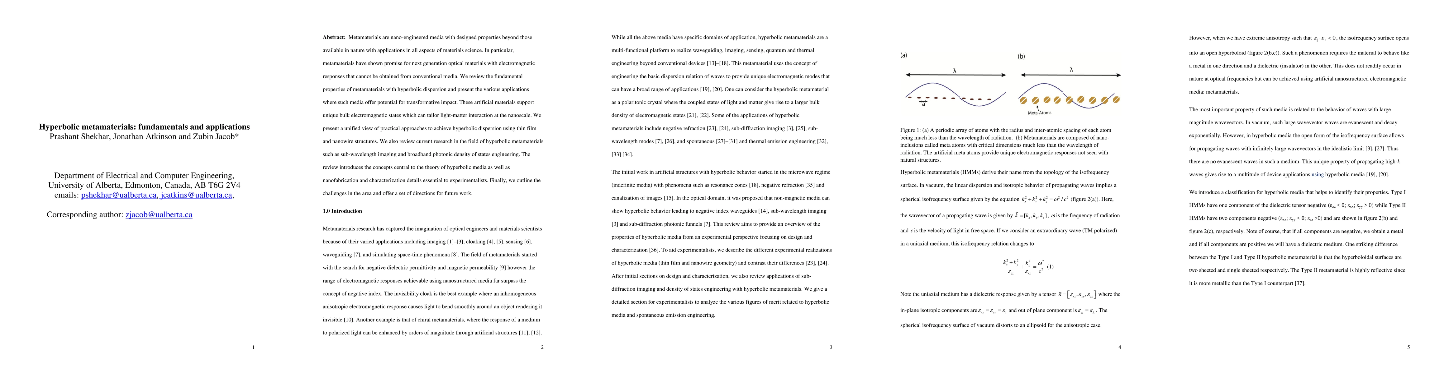 This paper reviews the fundamental properties and applications of hyperbolic metamaterials, which exhibit unique electromagnetic responses unattainable in conventional media. It discusses their potential for transformative impacts in sub-wavelength imaging and photonic engineering, while also outlining challenges and future research directions.