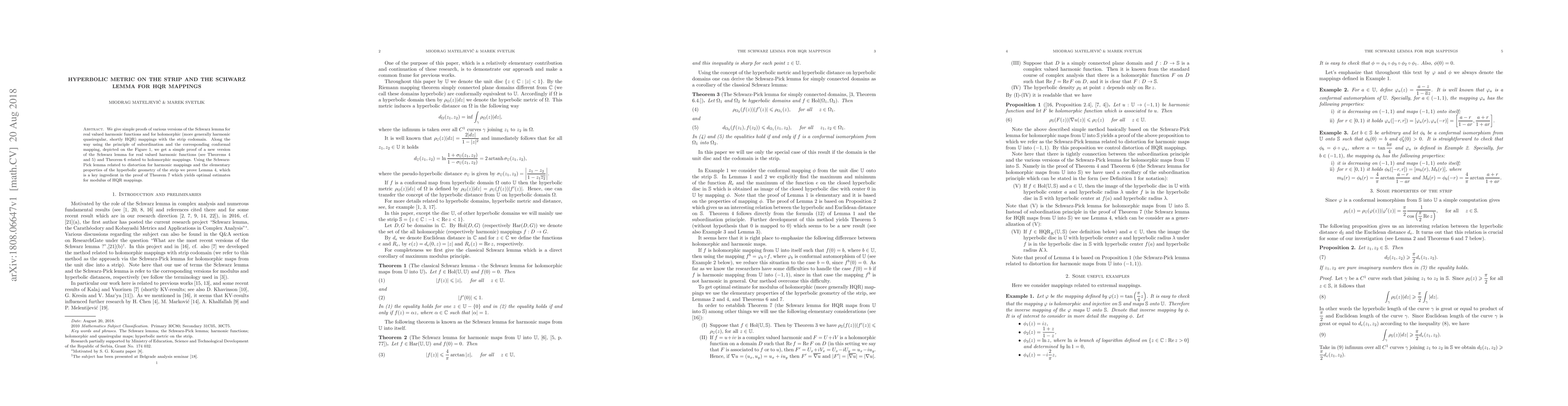 We give simple proofs of various versions of the Schwarz lemma for real valued harmonic functions and for holomorphic (more generally harmonic quasi\-re\-gu\-lar, shortly HQR) mappings with the strip codomain. Along the way using the principle of subordination and the corresponding conformal mapping, depicted on the Figure 1, we get a simple proof of a new version of the Schwarz lemma for real valued harmonic functions (see Theorems 4 and 5) and Theorem 6 related to holomorphic mappings. Using the Schwarz-Pick lemma related to distortion for harmonic mappings and the elementary properties of the hyperbolic geometry of the strip we prove Lemma 4, which is a key ingredient in the proof of Theorem 7 which yields optimal estimates for modulus of HQR mappings.
