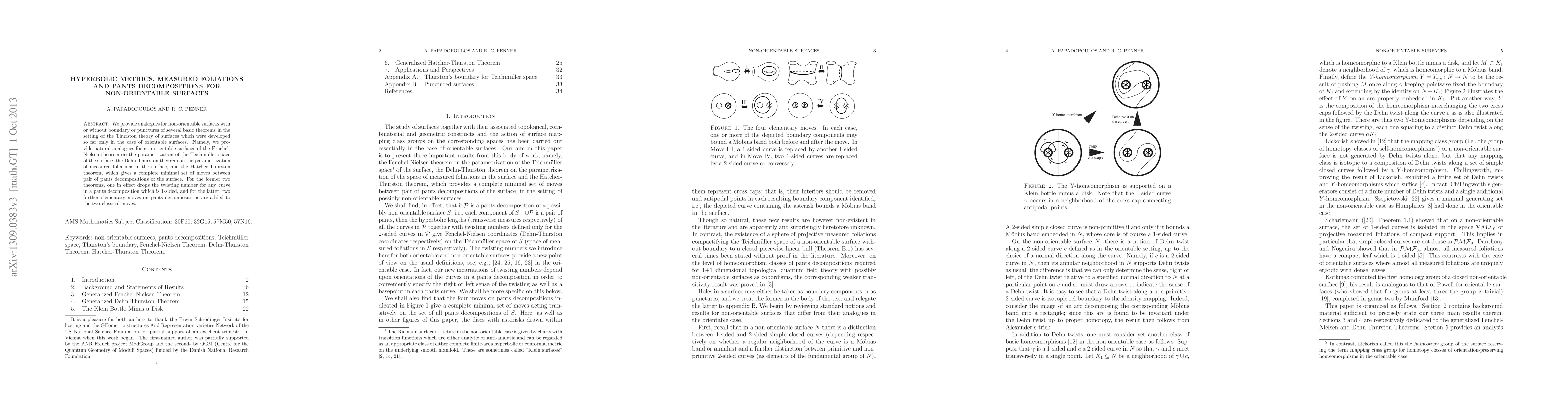 This paper extends fundamental theorems from the Thurston theory of surfaces to non-orientable surfaces, including the parametrization of Teichmüller space, measured foliations, and pants decompositions. It introduces modifications for 1-sided curves and new elementary moves for pants decompositions.