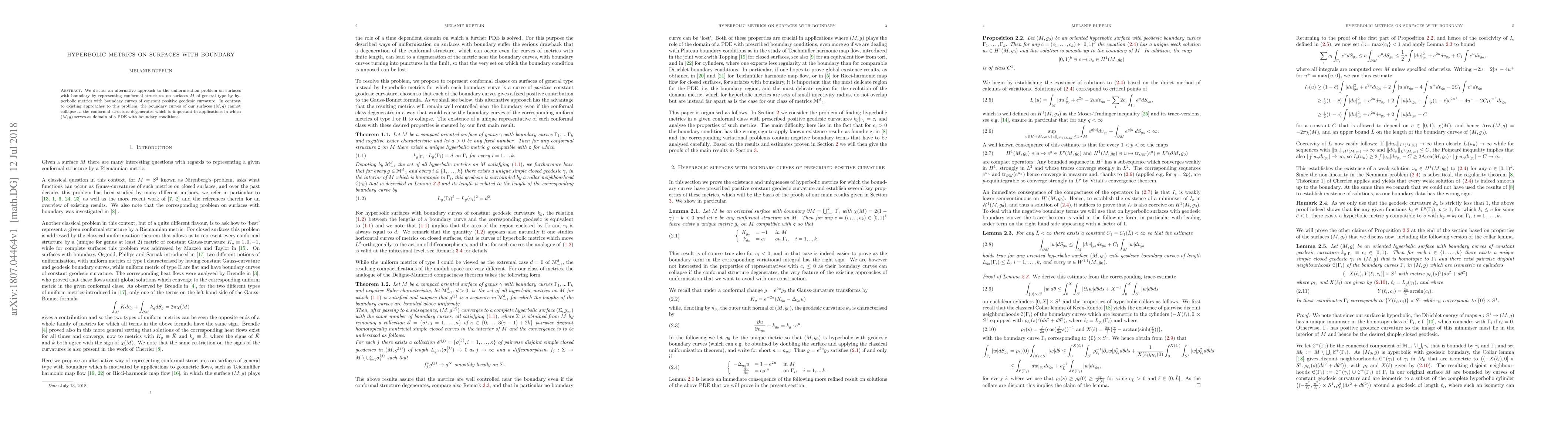 Researchers propose a new approach to solving the uniformisation problem on surfaces with boundary using hyperbolic metrics, which prevents boundary curves from collapsing under degenerate conformal structures.