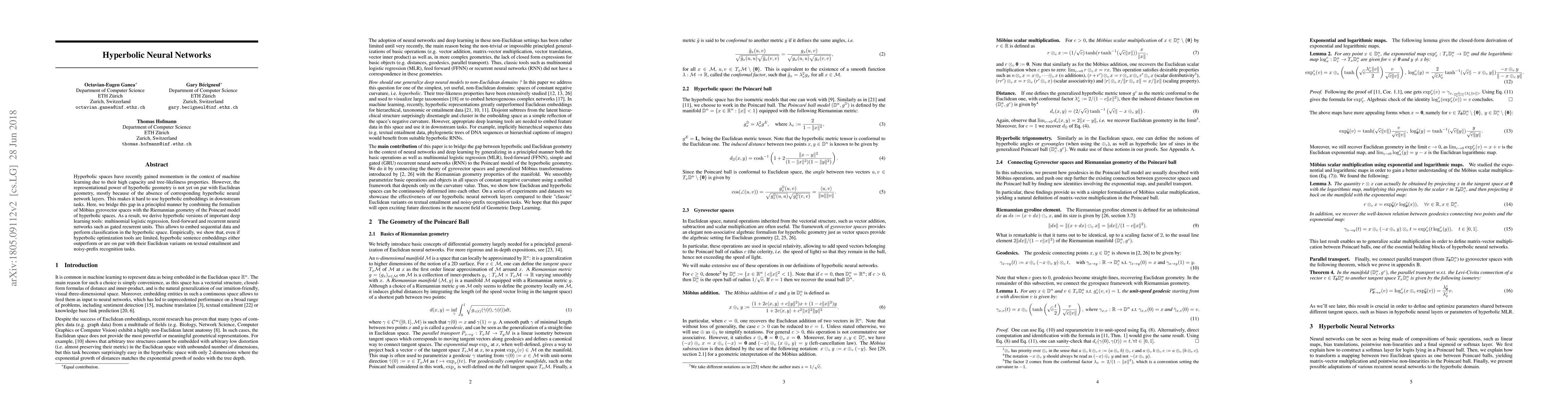 This paper introduces hyperbolic neural network layers by combining Möbius gyrovector spaces with Riemannian geometry, enabling the use of hyperbolic embeddings in machine learning tasks. Empirical results show that hyperbolic embeddings can outperform or match Euclidean embeddings in tasks like textual entailment and noisy-prefix recognition.