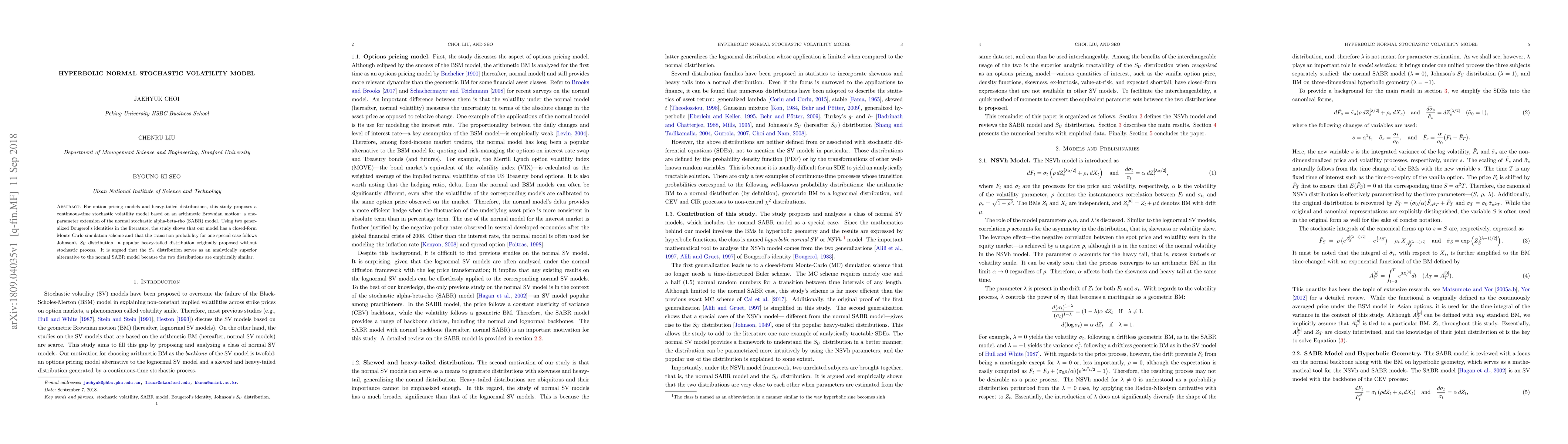 For option pricing models and heavy-tailed distributions, this study proposes a continuous-time stochastic volatility model based on an arithmetic Brownian motion: a one-parameter extension of the normal stochastic alpha-beta-rho (SABR) model. Using two generalized Bougerol's identities in the literature, the study shows that our model has a closed-form Monte-Carlo simulation scheme and that the transition probability for one special case follows Johnson's $S_U$ distribution---a popular heavy-tailed distribution originally proposed without stochastic process. It is argued that the $S_U$ distribution serves as an analytically superior alternative to the normal SABR model because the two distributions are empirically similar.