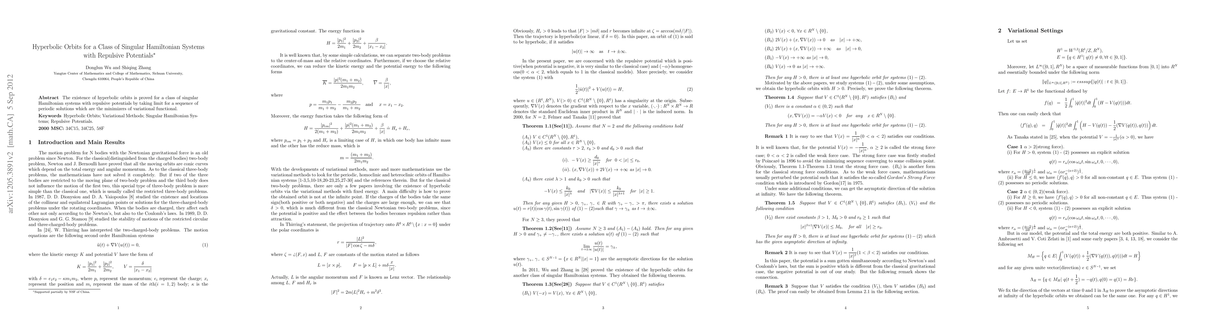 Summary: This paper proves the existence of hyperbolic orbits in singular Hamiltonian systems with repulsive potentials. The proof utilizes a limit approach based on periodic solutions that minimize a variational functional.