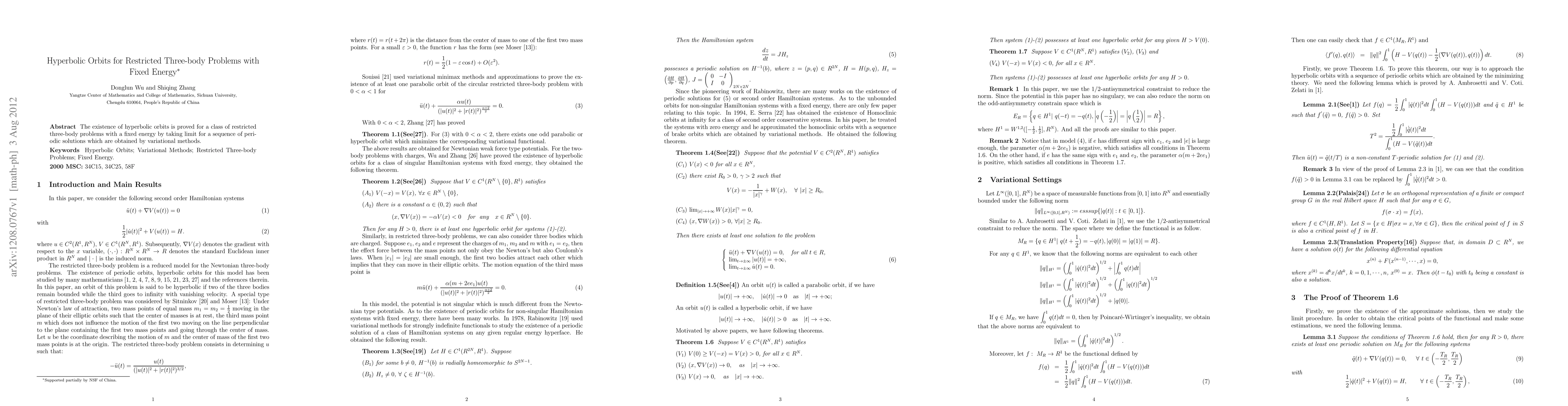 Summary: This paper proves the existence of hyperbolic orbits in a class of restricted three-body problems with fixed energy, utilizing variational methods to derive a sequence of periodic solutions that converge to the hyperbolic orbits.