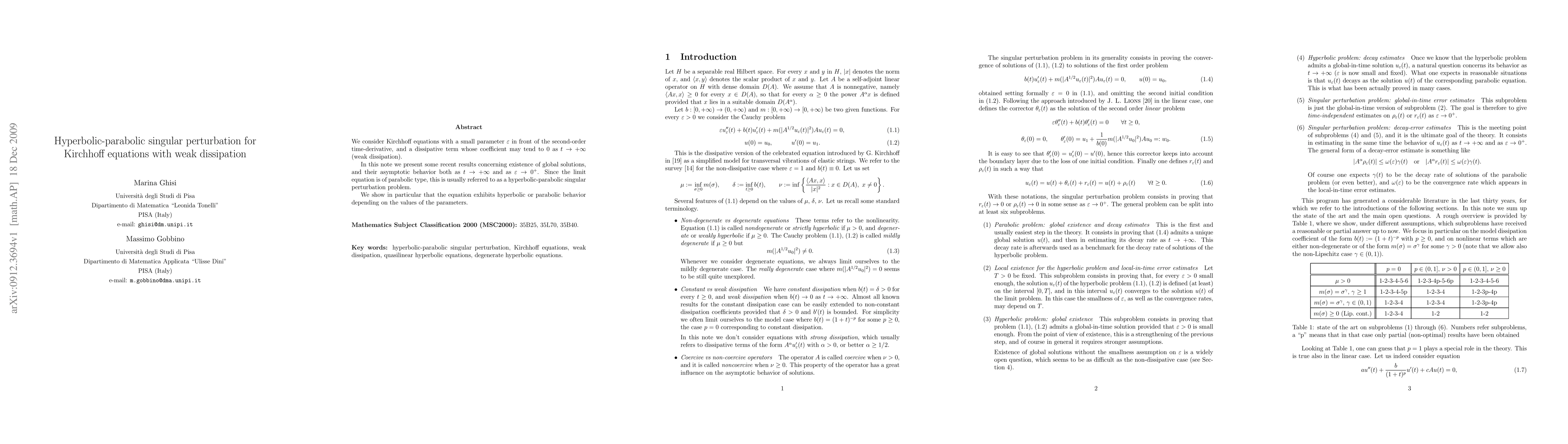 This paper investigates Kirchhoff equations with a small parameter in front of the second-order time-derivative and a weakly dissipative term. It presents results on the existence of global solutions and their asymptotic behavior, highlighting the transition between hyperbolic and parabolic behaviors as parameters vary.