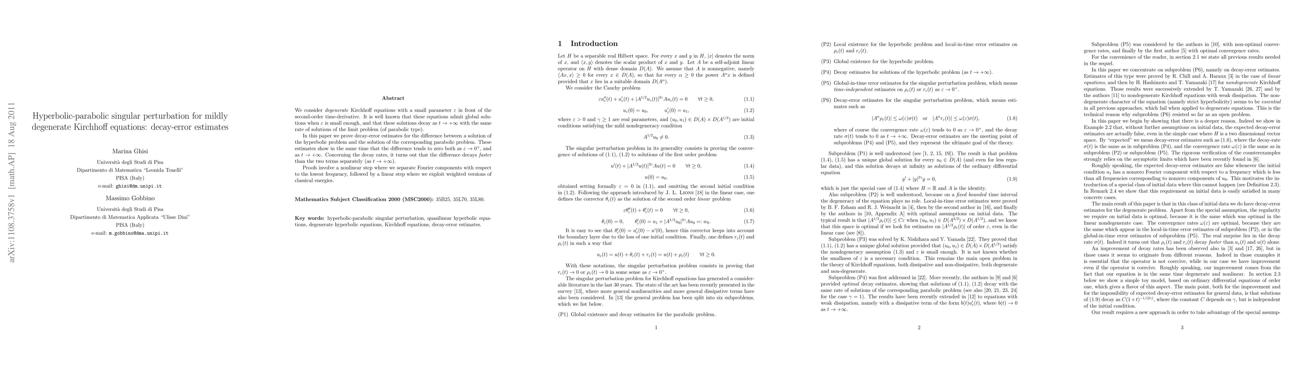 We consider degenerate Kirchhoff equations with a small parameter epsilon in front of the second-order time-derivative. It is well known that these equations admit global solutions when epsilon is small enough, and that these solutions decay as t -> +infinity with the same rate of solutions of the limit problem (of parabolic type). In this paper we prove decay-error estimates for the difference between a solution of the hyperbolic problem and the solution of the corresponding parabolic problem. These estimates show in the same time that the difference tends to zero both as epsilon -> 0, and as t -> +infinity. Concerning the decay rates, it turns out that the difference decays faster than the two terms separately (as t -> +infinity). Proofs involve a nonlinear step where we separate Fourier components with respect to the lowest frequency, followed by a linear step where we exploit weighted versions of classical energies.