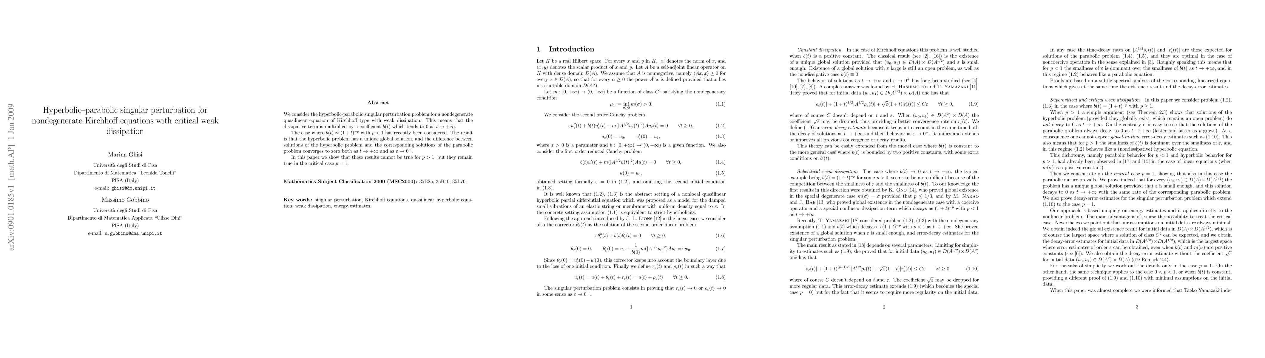 We consider the hyperbolic-parabolic singular perturbation problem for a nondegenerate quasilinear equation of Kirchhoff type with weak dissipation. This means that the dissipative term is multiplied by a coefficient b(t) which tends to 0 as t tends to +infinity. The case where b(t) behaves like (1+t)^{-p} with p<1 has recently been considered. The result is that the hyperbolic problem has a unique global solution, and the difference between solutions of the hyperbolic problem and the corresponding solutions of the parabolic problem converges to zero both as t tends to +infinity and as epsilon goes to 0. In this paper we show that these results cannot be true for p>1, but they remain true in the critical case p=1.