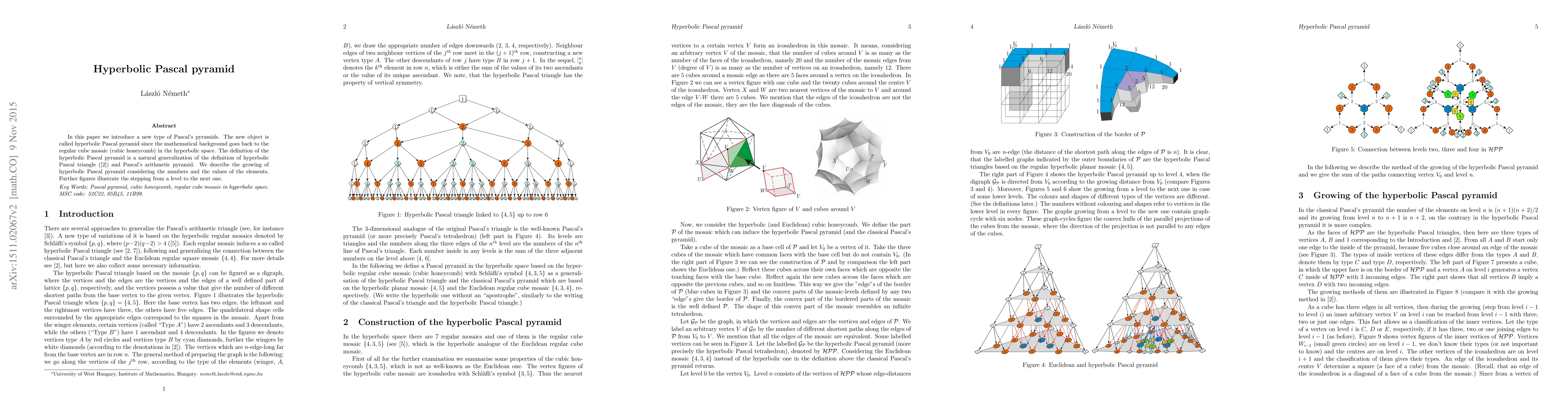 This paper introduces the hyperbolic Pascal pyramid, a novel extension of Pascal's triangle and pyramid concepts in hyperbolic space, derived from the cubic honeycomb structure. It explores the growth and numerical values of its elements, with illustrative diagrams showing transitions between levels.